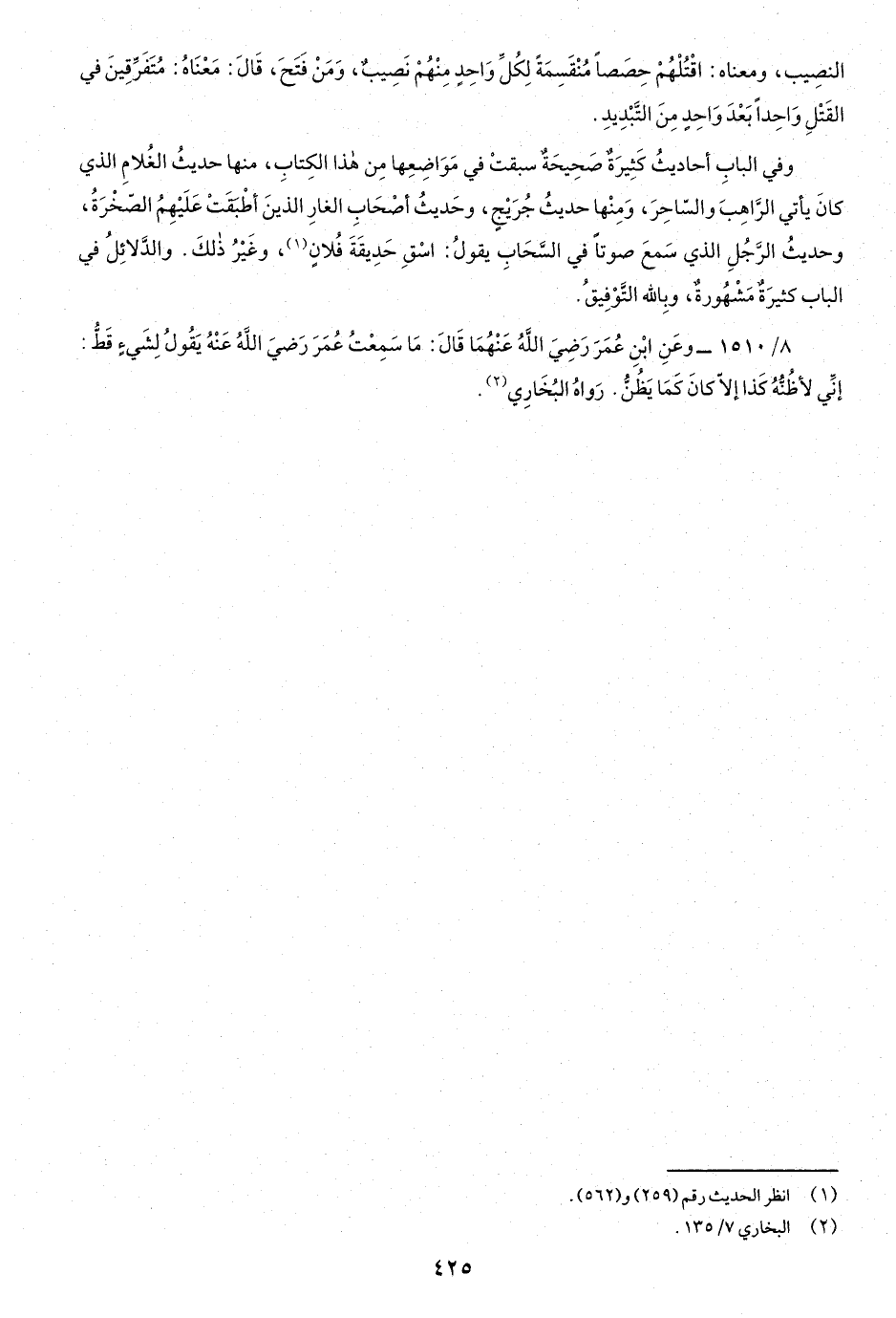 8/1510- وعَن ابْنِ عُمر رضي اللَّه عنْهُما قال: مَا سمِعْتُ عُمرَ رضي اللَّه عنْهُ يَقُولُ لِشَيءٍ قطُّ: إنِّي لأظُنَّهُ كَذا إلاَّ كَانَ كَمَا يَظُنُّ، رواهُ البُخَاري.