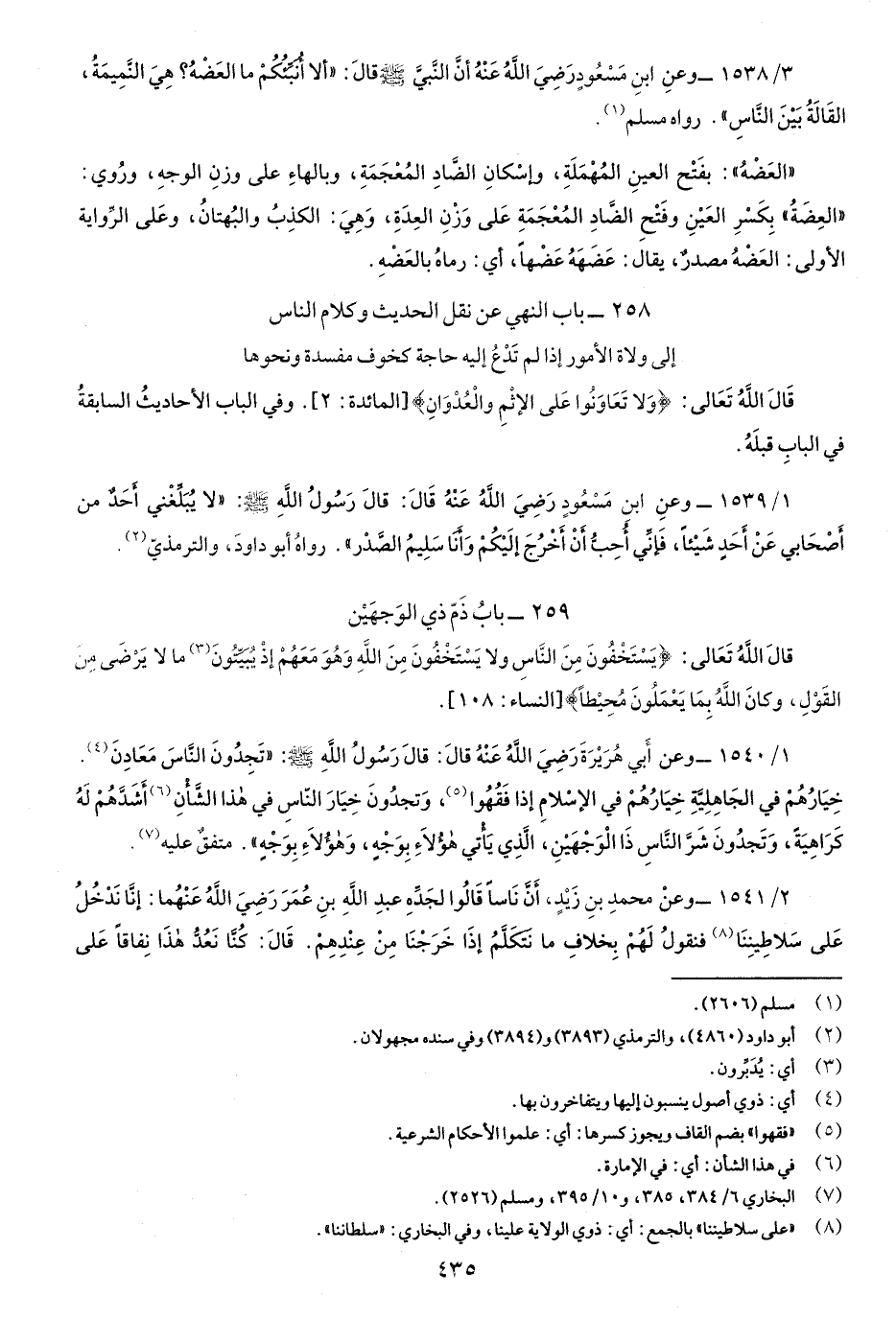258- باب النهي عن نَقْل الحديثِ وكلام الناس إِلَى ولاة الأمورِ إِذَا لَمْ تدْعُ إِلَيْهِ حاجةٌ كَخَوفِ مفسدةٍ ونحوها