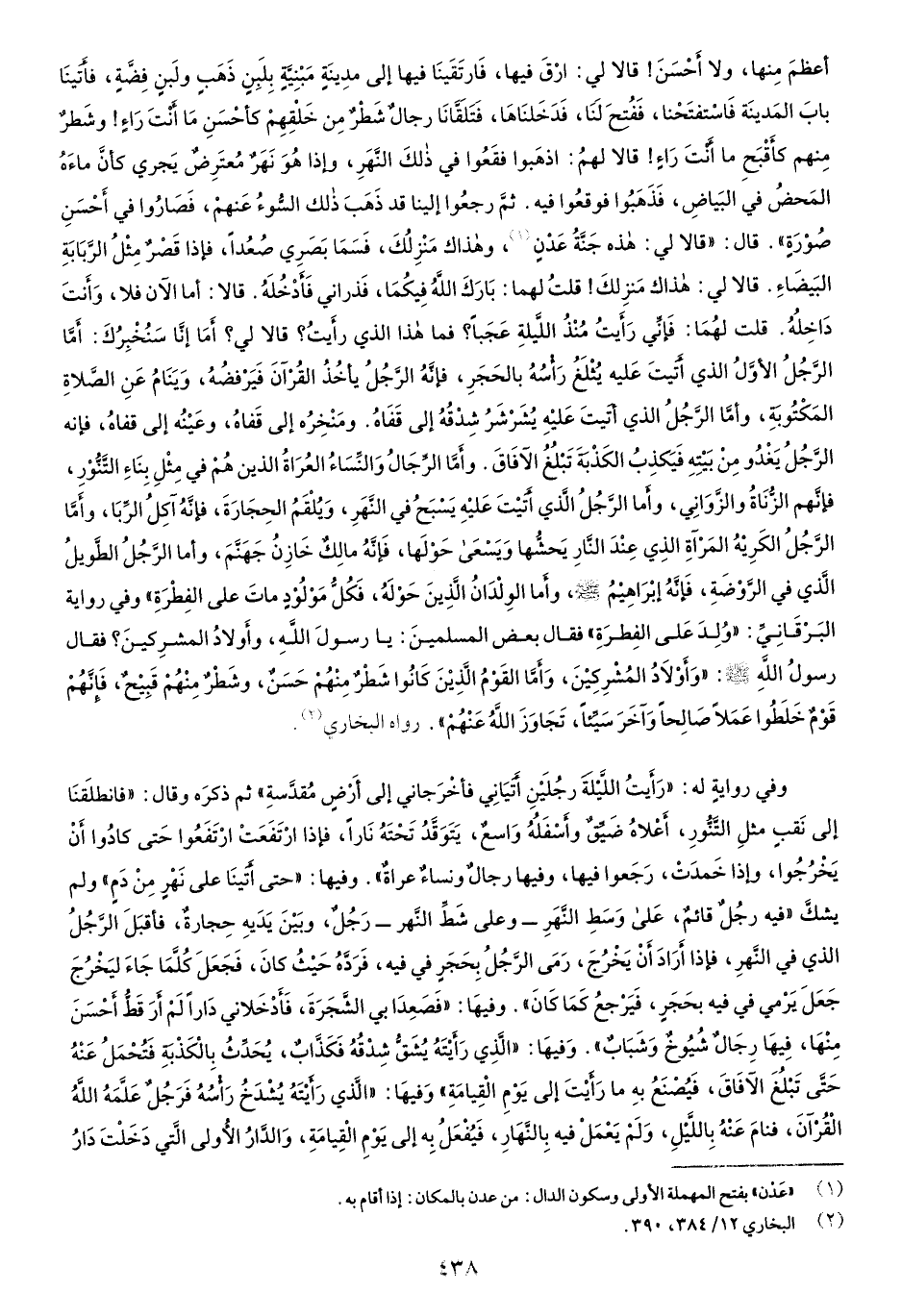 أعظمَ مِنها، وَلاَ أحْسنَ، قالا لي: ارْقَ فِيهَا، فَارتَقينا فِيهَا، إِلَى مدِينةٍ مَبْنِيَّةٍ بِلَبِنٍ ذَهبٍ ولبنٍ فضَّةٍ، فأتَينَا بَابَ المَدينة فَاسْتفتَحْنَا، فَفُتحَ لَنا، فَدَخَلناهَا، فَتَلَقَّانَا رجالٌ شَطْرٌ مِن خَلْقِهِم كأحْسنِ مَا أنت راءٍ، وشَطرٌ مِنهم كأَقْبحِ مَا أنتَ راءِ، قالا لَهُمْ: اذْهَبُوا فقَعُوا في ذَلِكَ النًّهْر، وَإِذَا هُوَ نَهرٌ معتَرِضٌ يجْرِي كأنَّ ماءَهُ المحضُ في البَيَاضِ، فذَهبُوا فوقعُوا فِيهِ، ثُمَّ رجعُوا إلَيْنَا قَدْ ذَهَب ذلكَ السُّوءُ عَنهمْ، فَصارُوا في أحْسَنِ صُورةٍ. قَالَ: قالا لِي: هذِهِ جَنَّةُ عدْن، وهذاك منزلُكَ، فسمَا بصَرِي صُعداً، فإذا قَصْرٌ مِثلُ الرَّبابة البيضاءِ. قالا لي: هذاكَ منزِلُكَ. قلتُ لهما: باركَ اللَّه فيكُما، فَذراني فأدخُلْه. قالا: أمَّا الآنَ فَلاَ، وأنتَ داخلُهُ. قُلْتُ لهُما: فَإنِّي رأَيتُ مُنْذُ اللَّيلة عَجَباً؟ فما هَذَا الذي رأيت؟ قالا لي: إنَا سَنخبِرُك. أمَّا الرجُلُ الأوَّلُ الَّذِي أتَيتَ عَليه يُثلَغُ رأسُهُ بالحَجَرِ، فإنَّهُ الرَّجُلُ يأخُذُ القُرْآنَ فيرفُضُه، وينامُ عَنِ الصَّلاةِ المكتُوبةِ. وأمَّا الرَّجُلُ الَّذِي أتَيتَ عَليْهِ يُشرْشرُ شِدْقُه إِلَى قَفاهُ، ومَنْخِرُه إِلَى قَفاهُ، وعَيْنهُ إِلَى قفاهُ، فإنَّهُ الرَّجُلُ يَغْدو مِنْ بَيْتِه فَيكذبُ الكذبةَ تبلُغُ الآفاقَ. وأمَّا الرِّجالُ والنِّساءُ العُراةُ الَّذِينَ هُمْ في مِثل بِناءِ التَّنُّورِ، فإنَّهم الزُّناةُ والزَّواني. وأما الرجُلُ الَّذي أتَيْت عليْهِ يسْبَحُ في النَهْرِ، ويلْقمُ الحِجارة، فإنَّهُ آكِلُ الرِّبا. وأمَّا الرَّجُلُ الكَريهُ المَرآةِ الَّذِي عندَ النَّارِ يَحُشُّها ويسْعى حَوْلَها فإنَّهُ مالِكُ خازنُ جَهنَّمَ. وأمَّا الرَّجُلُ الطَّويلُ الَّذي في الرَّوْضةِ، فإنَّهُ إبراهيم صلى الله عليه وسلم، وأمَّا الوِلدانُ الذينَ حوْله، فكلُّ مُوْلود ماتَ عَلَى الفِطْرَةِ"وفي رواية البَرْقَانِي:"وُلِد عَلَى الفِطْرَةِ". فَقَالَ بعض المسلمينَ: يَا رسولَ اللَّه، وأولادُ المشرِكينَ؟ فقال رسولُ اللَّه صَلّى اللهُ عَلَيْهِ وسَلَّم:"وأولادُ المشركينَ". وأما القومُ الذينَ كانُوا شَطْرٌ مِنْهُمْ حَسَنٌ وشَطْرٌ مِنْهُمْ قَبيحٌ فإنَّهُمْ قَومٌ خَلَطُوا عَمَلاً صَالِحاً وآخَرَ سَيِّئاً تَجاوَزَ الله عنهم". رواه البخاري.