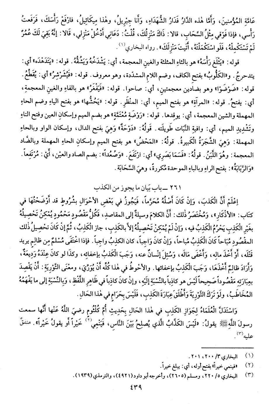 إْعْلَمْ أنَّ الْكَذب، وَإنْ كَانَ أصْلُهُ مُحرَّماً، فيَجُوزُ في بعْض الأحْوالِ بشرُوطٍ قَدْ أوْضَحْتُهَا في كتاب:"الأذْكارِ"ومُخْتَصَرُ ذَلِكَ أنَّ الكلامَ وسيلةٌ إِلَى المقاصدِ، فَكُلُّ مَقْصُودٍ محْمُودٍ يُمْكِن تحْصيلُهُ بغَيْر الْكَذِبِ يَحْرُمُ الْكذِبُ فِيهِ، وإنْ لَمْ يُمكِنْ تَحْصِيلُهُ إلاَّ بالكذبِ جازَ الْكذِبُ. ثُمَّ إنْ كانَ تَحْصِيلُ ذَلِكَ المقْصُودِ مُباحاً كَانَ الْكَذِبُ مُباحاً، وإنْ كانَ واجِباً، كَانَ الكَذِبُ واجِباً، فإذا اخْتَفى مُسْلمٌ مِن ظالمٍ يُريدُ قَتلَه، أوْ أخْذَ مالِه، وأخَفي مالَه، وسُئِل إنسانٌ عَنْهُ، وَجَبَ الكَذبُ بإخفائِه، وكذا لو كانَ عِندهُ وديعَةٌ، وأراد ظالِمٌ أخذَها، وجبَ الْكَذِبُ بإخفائها، والأحْوطُ في هَذَا كُلِّه أنْ يُوَرِّي، ومعْنَى التَّوْرِيةِ: أنْ يقْصِد بِعبارَتِه مَقْصُوداً صَحيحاً ليْسَ هُوَ كاذِباً بالنِّسّبةِ إلَيْهِ، وإنْ كانَ كاذِباً في ظاهِرِ اللًّفظِ، وبِالنِّسْبةِ إِلَى مَا يفهَمهُ المُخَاطَبُ ولَوْ تَركَ التَّوْرِيةَ وَأطْلَق عِبارةَ الكذِبِ، فليْس بِحرَامٍ في هَذَا الحَالِ.