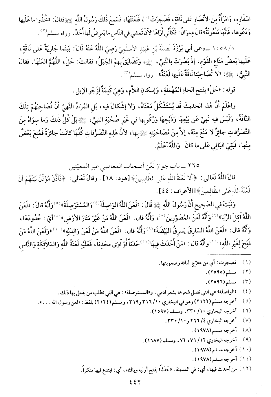8/1558- وعن أَبي برّزَةَ نَضلَةَ بْنِ عُبيْدٍ الأسلمِيِّ رضي اللَّه عنْهُ قَالَ: بَيْنَمَا جاريةٌ عَلَى ناقَةٍ علَيها بعضُ متَاع القَوْمِ، إذْ بَصُرَتْ بالنبيِّ صَلّى اللهُ عَلَيْهِ وسَلَّم وتَضايَقَ بهمُ الجَبلُ، فقالتْ: حَلْ، اللَّهُم العنْها فَقَالَ النبيُّ صَلّى اللهُ عَلَيْهِ وسَلَّم: "لاَ تُصاحِبْنا نَاقَةٌ عَلَيْهَا لعْنةٌ "رواه مسلم.