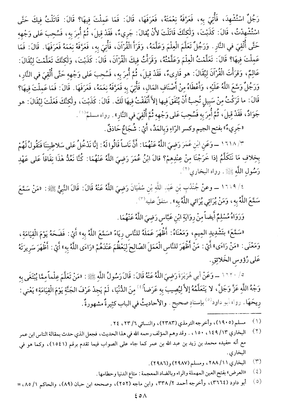 رجُلٌ اسْتُشْهِدَ، فَأُتِىَ بِهِ، فَعرَّفَهُ نِعْمَتَهُ، فَعَرفَهَا، قالَ: فَمَا عَمِلْتَ فِيها؟ قَالَ: قَاتَلْتُ فِيكَ حَتَّى اسْتُشْهِدْتُ: قالَ كَذَبْت، وَلكِنَّكَ قَاتلْتَ لأنَ يُقالَ جَرِيء، فَقَدْ قِيلَ، ثُمَّ أُمِرَ بِهِ فَسُحِبَ عَلى وَجْهِهِ حَتَّى أُلْقِىَ في النَّارِ. وَرَجُل تَعلَّم الْعِلّمَ وعَلَّمَهُ، وقَرَأ الْقُرْآنَ، فَأتِىَ بِهِ، فَعَرَّفَهُ نِعَمهُ فَعَرَفَهَا. قالَ: فمَا عمِلْتَ فِيهَا؟ قالَ: تَعلَّمْتُ الْعِلْمَ وَعَلَّمْتُهُ، وَقَرَأتُ فِيكَ الْقُرآنَ، قَالَ: كَذَبْتَ، ولكِنَّك تَعَلَّمْت الْعِلْمَ ليقال عالم، وقَرَأتُ الْقرآن لِيقالَ: هو قَارِىءٌ، فَقَدْ قِيلَ، ثُمَّ أمِرَ، فَسُحِبَ عَلى وَجْهِهِ حَتَّى أُلْقِىَ في النَّارِ، وَرَجُلٌ وسَّعَ اللَّه عَلَيْهِ، وَأعْطَاه مِنْ أصنَافِ المَال، فَأُتِى بِهِ فَعرَّفَهُ نعمَهُ، فَعَرَفَهَا. قَالَ: فَمَا عَمِلْت فِيهَا؟ قَالَ: مَا تركتُ مِن سَبيلٍ تُحِبُّ أنْ يُنْفَقَ فيهَا إلاَّ أنْفَقْتُ فِيهَا لَك. قَالَ: كَذَبْتَ، ولكِنَّكَ فَعَلْتَ ليُقَالَ: هو جَوَادٌ فَقَدْ قيلَ، ثُمَّ أمِرَ بِهِ فَسُحِبَ عَلَى وجْهِهِ ثُمَّ ألْقِىَ في النَّارِ" رواه مسلم.