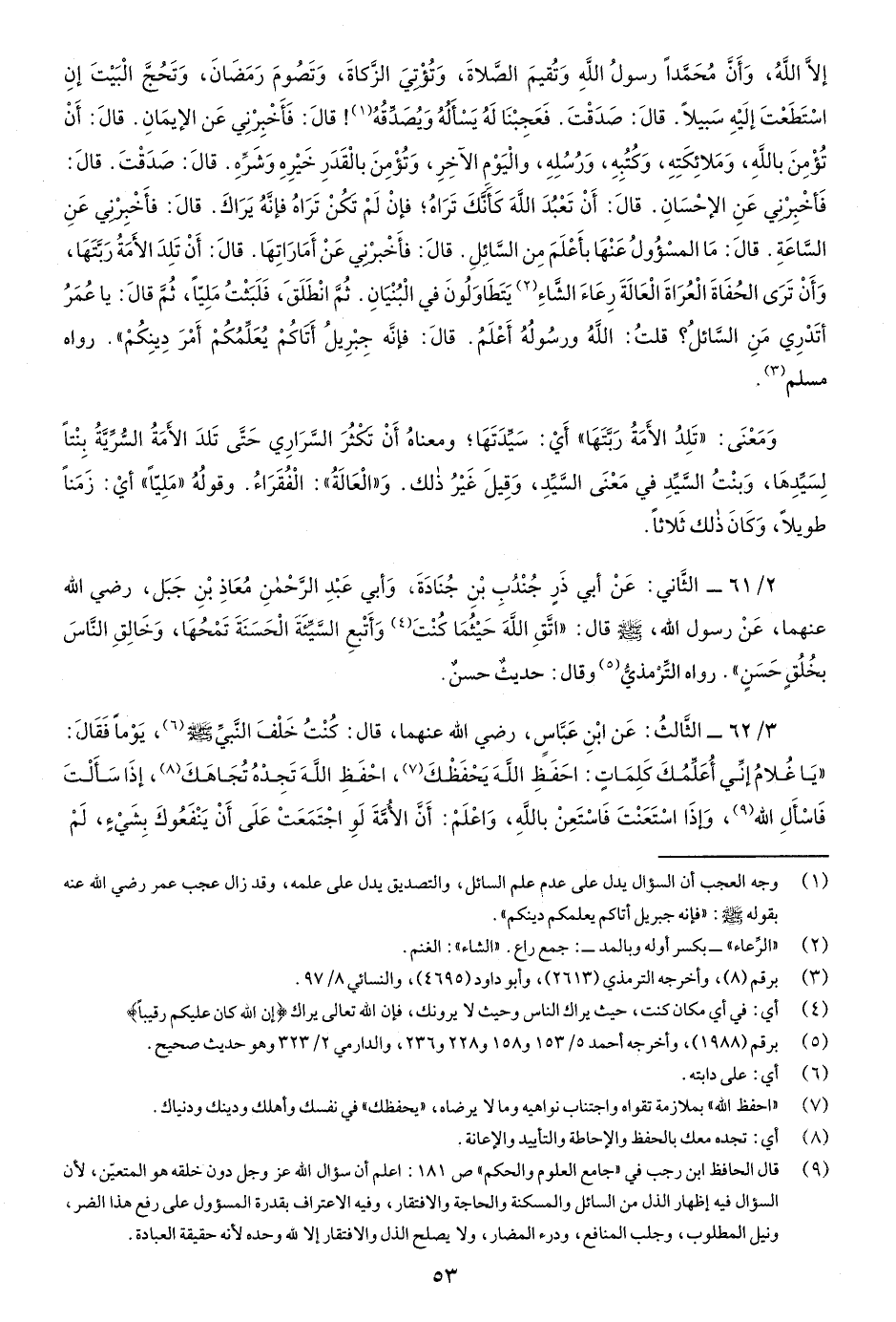 إِلاَّ اللَّهُ، وأَنَّ مُحَمَّداً رسولُ اللَّهِ وَتُقِيمَ الصَّلاَةَ، وَتُؤتِيَ الزَّكاةَ، وتصُومَ رَمضَانَ، وتحُجَّ الْبيْتَ إِنِ استَطَعتَ إِلَيْهِ سَبيلاً. قَالَ: صدَقتَ. فَعجِبْنا لَهُ يسْأَلُهُ ويصدِّقُهُ، قَالَ: فَأَخْبِرْنِي عَنِ الإِيمانِ. قَالَ: أَنْ تُؤْمِن بِاللَّهِ وملائِكَتِهِ، وكُتُبِهِ ورُسُلِهِ، والْيومِ الآخِرِ، وتُؤمِنَ بالْقَدَرِ خَيْرِهِ وشَرِّهِ. قَالَ: صدقْتَ قَالَ: فأَخْبِرْنِي عَنِ الإِحْسانِ. قَالَ: أَنْ تَعْبُدَ اللَّه كَأَنَّكَ تَراهُ. فإِنْ لَمْ تَكُنْ تَراهُ فإِنَّهُ يَراكَ قَالَ: فَأَخْبِرْنِي عَنِ السَّاعةِ. قَالَ: مَا المسْؤُولُ عَنْهَا بأَعْلَمَ مِن السَّائِلِ. قَالَ: فَأَخْبرْنِي عَنْ أَمَاراتِهَا. قَالَ أَنْ تلدَ الأَمَةُ ربَّتَها، وَأَنْ تَرى الحُفَاةَ الْعُراةَ الْعالَةَ رِعاءَ الشَّاءِ يتَطاولُون في الْبُنيانِ ثُمَّ انْطلَقَ، فلبثْتُ ملِيًّا، ثُمَّ قَالَ: يَا عُمرُ، أَتَدرِي منِ السَّائِلُ قلتُ: اللَّهُ ورسُولُهُ أَعْلمُ قَالَ: فَإِنَّهُ جِبْرِيلُ أَتَاكُمْ يُعلِّمُكم دِينِكُمْ "رواه مسلمٌ.