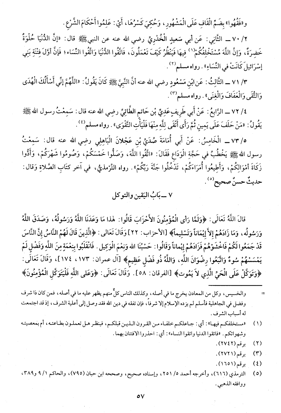 2/70-الثَّانِي: عَنْ أبي سَعيدٍ الْخُدْرِيِّ رضي اللَّه عنه عن النبيِّ صَلّى اللهُ عَلَيْهِ وسَلَّم قَالَ: "إنَّ الدُّنْيا حُلْوَةٌ خضِرَةٌ، وإنَّ اللَّهَ مُسْتَخْلِفُكُمْ فِيهَا. فينْظُر كَيْفَ تَعْمَلُونَ. فَاتَّقوا الدُّنْيَا واتَّقُوا النِّسَاءِ. فَإِنَّ أَوَّلَ فِتْنةِ بَنِي إسْرَائيلَ كَانَتْ في النسَاء" رواه مسلم.