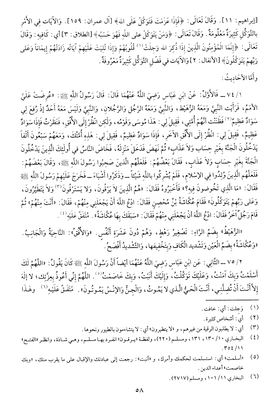 1/74- فَالأوَّلَ: عَن ابْن عَبَّاسٍ رضي اللَّهُ عنهما قَالَ: قَالَ رسولُ اللَّه صلى اللَّه عليه وآله وسلم: "عُرضَت عليَّ الأمَمُ، فَرَأيْت النَّبِيَّ وَمعَه الرُّهيْطُ والنَّبِيَّ ومَعهُ الرَّجُل وَالرَّجُلانِ، وَالنَّبِيَّ وليْسَ مَعهُ أحدٌ إِذْ رُفِعَ لِى سوادٌ عظيمٌ فظننتُ أَنَّهُمْ أُمَّتِي، فَقِيلَ لِى: هَذَا مُوسَى وقومه ولكن انظر إلى الأفق فَإِذا سَوادٌ عَظِيمٌ فقيلَ لي انْظُرْ إِلَى الأفُقِ الآخَرِ فَإِذَا سَوَادٌ عَظيمٌ فقيلَ لِي: هَذه أُمَّتُكَ، ومعَهُمْ سبْعُونَ أَلْفاً يَدْخُلُونَ الْجَنَّة بِغَيْرِ حِسَابٍ ولا عَذَابٍ"ثُمَّ نَهَض فَدَخَلَ منْزِلَهُ، فَخَاض النَّاسُ في أُولَئِكَ الَّذينَ يدْخُلُون الْجنَّةَ بِغَيْرِ حسابٍ وَلا عذابٍ، فَقَالَ بعْضهُمْ: فَلَعَلَّهُمْ الَّذينَ صَحِبُوا رسولَ اللَّه صَلّى اللهُ عَلَيْهِ وسَلَّم، وقَال بعْضهُم: فَلعَلَّهُمْ الَّذينَ وُلِدُوا في الإسْلامِ، فَلَمْ يُشْرِكُوا باللَّه شَيئاً -وذَكَروا أشْياء - فَخرجَ عَلَيْهمْ رسولُ اللَّه صَلّى اللهُ عَلَيْهِ وسَلَّم فَقَالَ:"مَا الَّذي تَخُوضونَ فِيهِ؟ "فَأخْبَرُوهُ فَقَالَ:"هُمْ الَّذِينَ لا يرقُونَ، وَلا يَسْتَرْقُونَ، وَلاَ يَتَطيَّرُون، وَعَلَى ربِّهمْ يتَوكَّلُونَ"فقَامَ عُكَّاشةُ بنُ مُحْصِن فَقَالَ: ادْعُ اللَّه أنْ يجْعَلَني مِنْهُمْ، فَقَالَ:"أنْت مِنْهُمْ"ثُمَّ قَام رَجُلٌ آخَرُ فَقَالَ: ادْعُ اللَّه أنْ يَجْعَلَنِي مِنْهُمْ فَقَالَ:"سَبَقَكَ بِهَا عُكَّاشَةُ "متفقٌ عَلَيهِ.