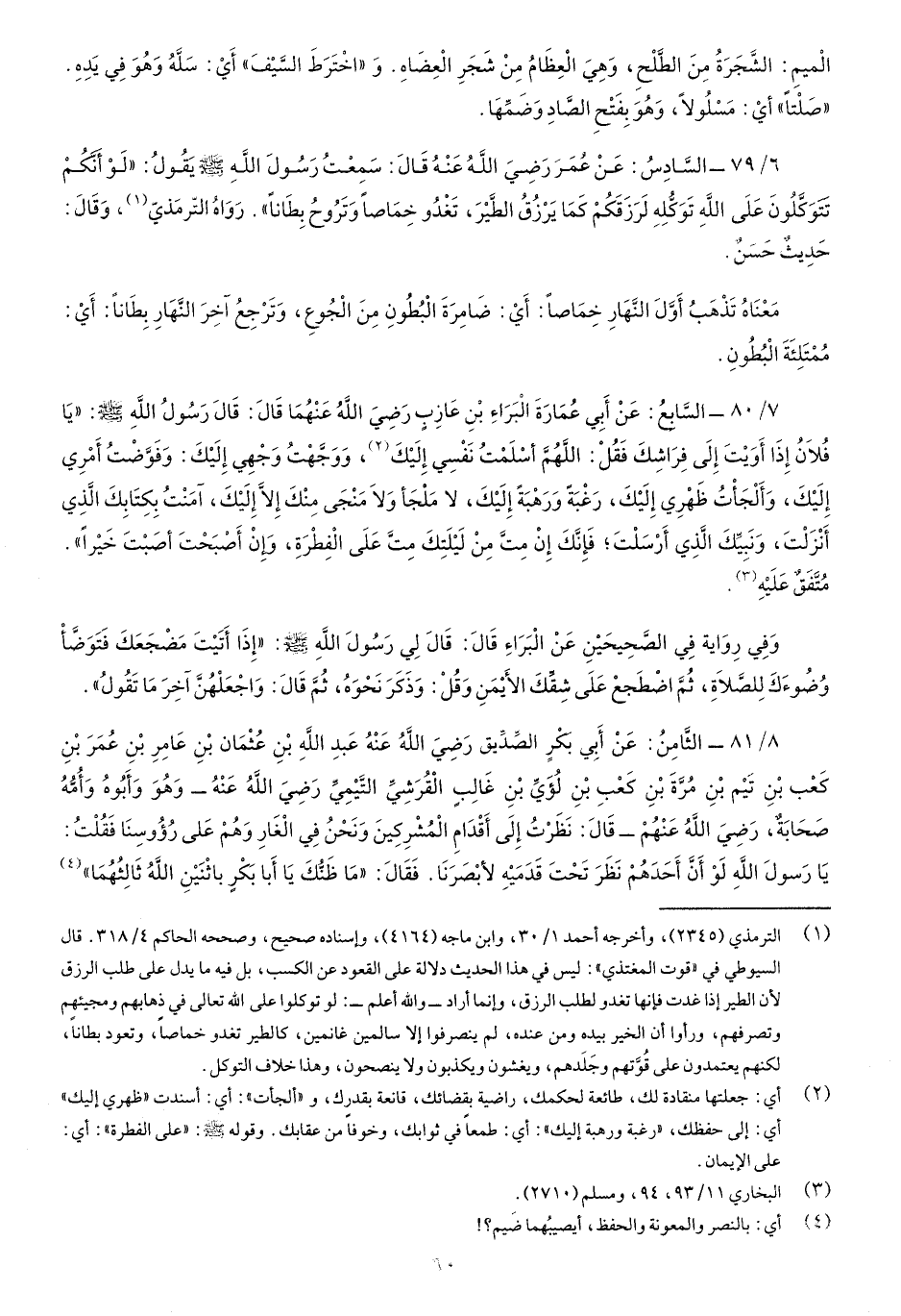 6/79-السادِسُ: عنْ عمرَ رضي اللَّهُ عنه قالَ: سمعْتُ رسولَ اللَّه صَلّى اللهُ عَلَيْهِ وسَلَّم يقُولُ: "لَوْ أنَّكم تتوكَّلونَ عَلَى اللَّهِ حقَّ تَوكُّلِهِ لرزَقكُم كَما يرزُقُ الطَّيْرَ، تَغْدُو خِماصاً وترُوحُ بِطَاناً" رواه الترمذي، وقال: حديثٌ حسنٌ.