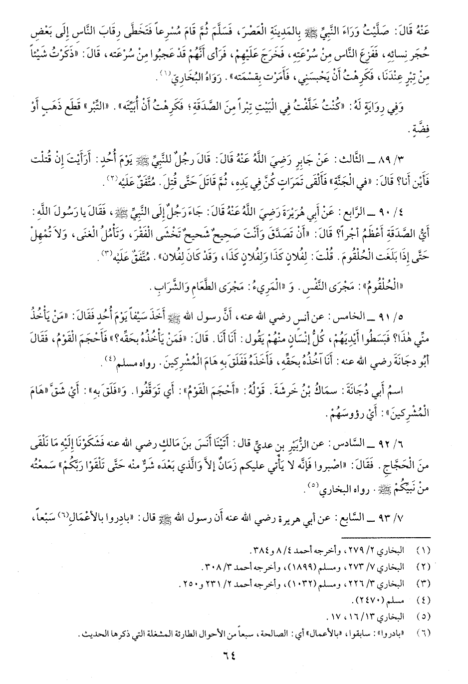 5/91-الخامس: عن أنس رضي اللَّه عنه، أَنَّ رسولَ اللَّه صَلّى اللهُ عَلَيْهِ وسَلَّم أَخذَ سيْفاً يَومَ أُحدٍ فقَالَ: "مَنْ يأْخُذُ منِّي هَذا؟ فبسطُوا أَيدِيهُم، كُلُّ إنْسانٍ منهمْ يقُول: أَنا أَنا. قَالَ:"فمنْ يأَخُذُهُ بحقِه؟ فَأَحْجمِ الْقومُ، فَقَالَ أَبُو دُجَانَةَ رضي اللَّه عنه: أَنا آخُذه بحقِّهِ، فأَخَذهُ ففَلق بِهِ هَام الْمُشْرِكينَ". رواه مسلم.