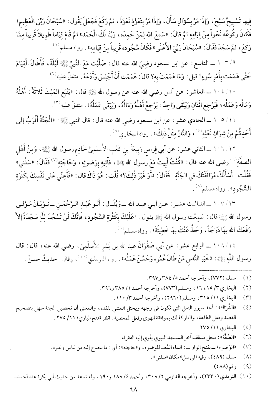 13/107-الثالث عشر: عن أبي عبد اللَّه ويُقَالُ: أبُو عبْدِ الرَّحمنِ ثَوْبانَ موْلى رسولِ اللَّهِ صَلّى اللهُ عَلَيْهِ وسَلَّم قَالَ: سمِعْتُ رسولَ اللَّه صَلّى اللهُ عَلَيْهِ وسَلَّم يَقُولُ: "عليكَ بِكَثْرةِ السُّجُودِ، فإِنَّك لَنْ تَسْجُد للَّهِ سجْدةً إلاَّ رفَعكَ اللَّهُ بِهَا دَرجَةً، وحطَّ عنْكَ بِهَا خَطِيئَةً "رواه مسلم.