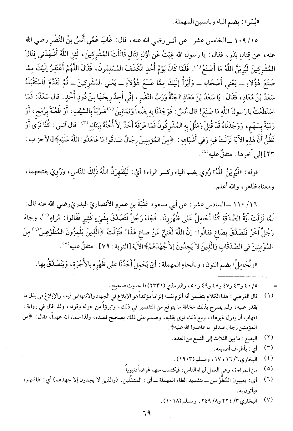 16/110- السادس عشر: عن أبي مسعود عُقْبَةَ بن عمروٍ الأنصاريِّ البدريِّ رضي اللَّهُ عنه قَالَ: لمَّا نَزَلَتْ آيةُ الصَّدقَةِ كُنَّا نُحَامِلُ عَلَى ظُهُورِنا. فَجَاءَ رَجُلٌ فَتَصَدَّقَ بِشَيْءٍ كَثِيرٍ فَقَالُوا: مُراءٍ، وجاءَ رَجُلٌ آخَرُ فَتَصَدَّقَ بِصَاعٍ فقالُوا: إنَّ اللَّه لَغَنِيٌّ عَنْ صاعِ هَذَا، فَنَزَلَتْ {الَّذِينَ يَلْمِزُونَ الْمُطَّوِّعِينَ مِنَ الْمُؤْمِنِينَ فِي الصَّدَقَاتِ وَالَّذِينَ لا يَجِدُونَ إِلاَّ جُهْدَهُمْ} الآية [التوبة: 79] متفقٌ عليه.