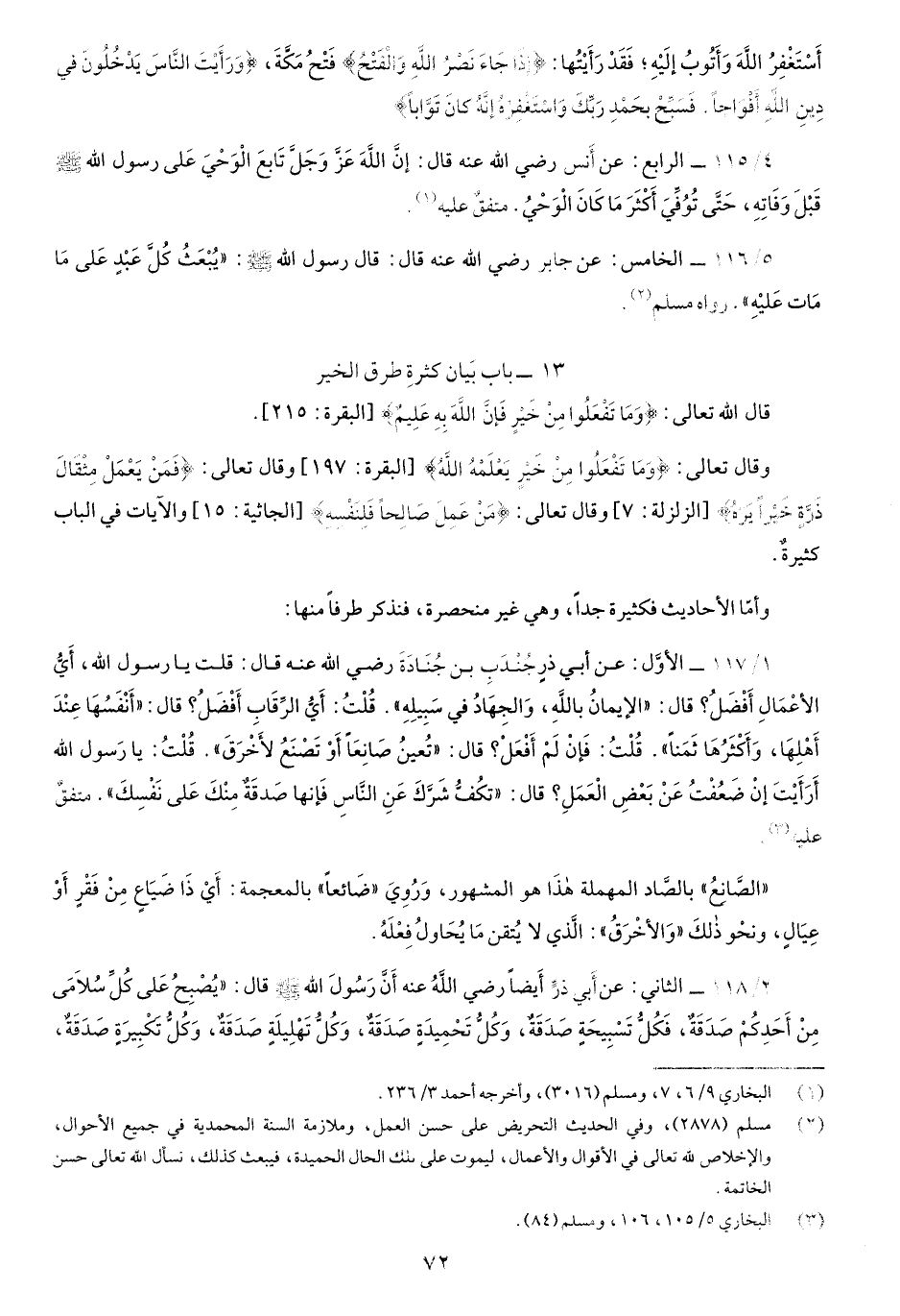 1/117-الأوَّل: عن أَبِي ذرٍّ جُنْدَبِ بنِ جُنَادَةَ رضي اللَّه عنه قَالَ: قُلْتُ يَا رسولَ اللَّه، أيُّ الأعْمالِ أفْضَلُ؟ قَالَ: "الإِيمانُ بِاللَّهِ، وَالجِهَادُ فِي سَبِيلِهِ ". قُلْتُ: أيُّ الرِّقَابِ أفْضَلُ؟ قَالَ: "أنْفَسُهَا عِنْد أهْلِهَا، وأكثَرُهَا ثَمَناً". قُلْتُ: فَإِنْ لَمْ أفْعلْ؟ قَالَ:"تُعينُ صَانِعاً أوْ تَصْنَعُ لأخْرَقَ"قُلْتُ: يَا رَسُول اللَّه أرَأيتَ إنْ ضَعُفْتُ عَنْ بَعْضِ الْعملِ؟ قَالَ:"تَكُفُّ شَرَّكَ عَن النَّاسِ فَإِنَّها صدقةٌ مِنْكَ عَلَى نَفسِكَ". متفقٌ عليه.