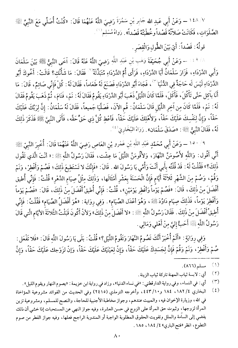 8/149- وعن أَبِي جُحَيْفَةَ وَهبِ بْنِ عبد اللَّه رضي اللَّهُ عنه قَالَ: آخَى النَّبِيُّ صَلّى اللهُ عَلَيْهِ وسَلَّم بَيْن سَلْمَانَ وأَبِي الدَّرْدَاءِ، فَزَارَ سلْمَانُ أَبَا الدَّرْدَاءِ، فَرَأَى أُمَّ الدَّرْدَاء مُتَبَذِّلَةً فقالَ: مَا شَأْنُكِ؟ قالَتْ: أَخْوكَ أَبُو الدَّرداءِ ليْسَ لَهُ حَاجةٌ فِي الدُّنْيَا. فَجَاءَ أَبُو الدرْدَاءِ فَصَنَعَ لَه طَعَاماً، فقالَ لَهُ: كُلْ فَإِنِّي صَائِمٌ، قالَ: مَا أَنا بآكلٍ حَتَّى تأْكلَ، فَأَكَلَ، فَلَّمَا كانَ اللَّيْلُ ذَهَبَ أَبُو الدَّرْداءِ يقُوم فَقَالَ لَه: نَمْ فَنَام، ثُمَّ ذَهَبَ يَقُوم فقالَ لَه: نَمْ، فَلَمَّا كَانَ من آخرِ اللَّيْلِ قالَ سلْمانُ: قُم الآنَ، فَصَلَّيَا جَمِيعاً، فقالَ لَهُ سَلْمَانُ: إِنَّ لرَبِّكَ عَلَيْكَ حَقًّا، وَإِنَّ لنَفْسِكَ عَلَيْكَ حَقّاً، ولأهلِك عَلَيْكَ حَقًّا، فَأَعْطِ كُلَّ ذِي حَقٍّ حَقَّه، فَأَتَى النَّبِيَّ صَلّى اللهُ عَلَيْهِ وسَلَّم فَذَكر ذلكَ لَه، فقالَ النَّبِيُّ صَلّى اللهُ عَلَيْهِ وسَلَّم: "صَدَقَ سلْمَانُ" رواه البخاري.