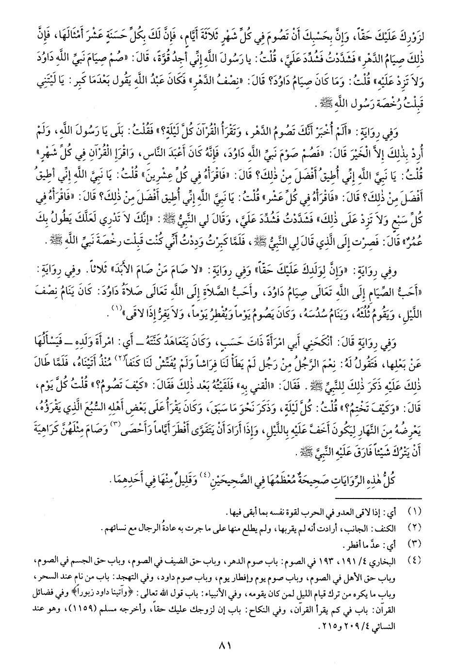 وفي رواية:"وَإِنَّ لوَلَدِكَ علَيْكَ حَقًّا"وفي روايةٍ: لاَ صَامَ مَنْ صَامَ الأَبَدَ"ثَلاثاً. وفي روايةٍ: "أَحَبُّ الصَّيَامِ إِلَى اللَّه تَعَالَى صِيَامُ دَاوُدَ، وَأَحَبُّ الصَّلاةِ إِلَى اللَّهِ تَعَالَى صَلاةُ دَاوُدَ: كَانَ يَنَامُ نِصْفَ اللَّيلِ، وَيَقُومُ ثُلُثَهُ، وَيَنَامُ سُدُسَهُ، وَكَانَ يَصُومُ يوْماً ويُفْطِرُ يَوْماً، وَلا يَفِرُّ إِذَا لاقَى".