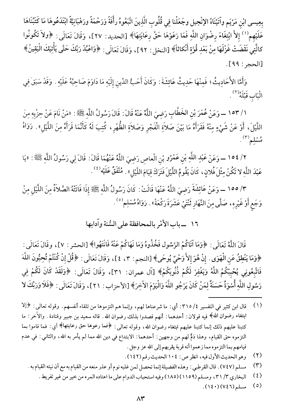 2/154- وعن عبدِ اللَّه بنِ عمرو بنِ العاص رضي اللَّه عنهما قَالَ: قَالَ لي رسولُ اللَّه صَلّى اللهُ عَلَيْهِ وسَلَّم: "يَا عبْدَ اللَّه لاَ تَكُنْ مِثلْ فُلانٍ، كَانَ يقُومُ اللَّيْلَ فَتَركَ قِيامَ اللَّيْل" متفقٌ عَلَيهِ