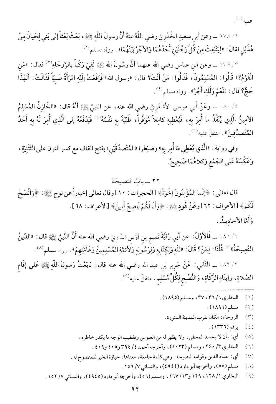 1/181- فَالأَوَّلُ: عن أَبِي رُقيَّةَ تَميمِ بنِ أَوْس الدَّارِيِّ رضي اللَّه عنه أَنَّ النَّبِيَّ صَلّى اللهُ عَلَيْهِ وسَلَّم قَالَ: "الدِّينُ النَّصِيحَةُ"قُلْنَا: لِمَنْ؟ قَالَ"للَّه وَلِكِتَابِهِ ولِرسُولِهِ وَلأَئمَّةِ المُسْلِمِينَ وَعَامَّتِهِمْ "رواه مُسْلم.