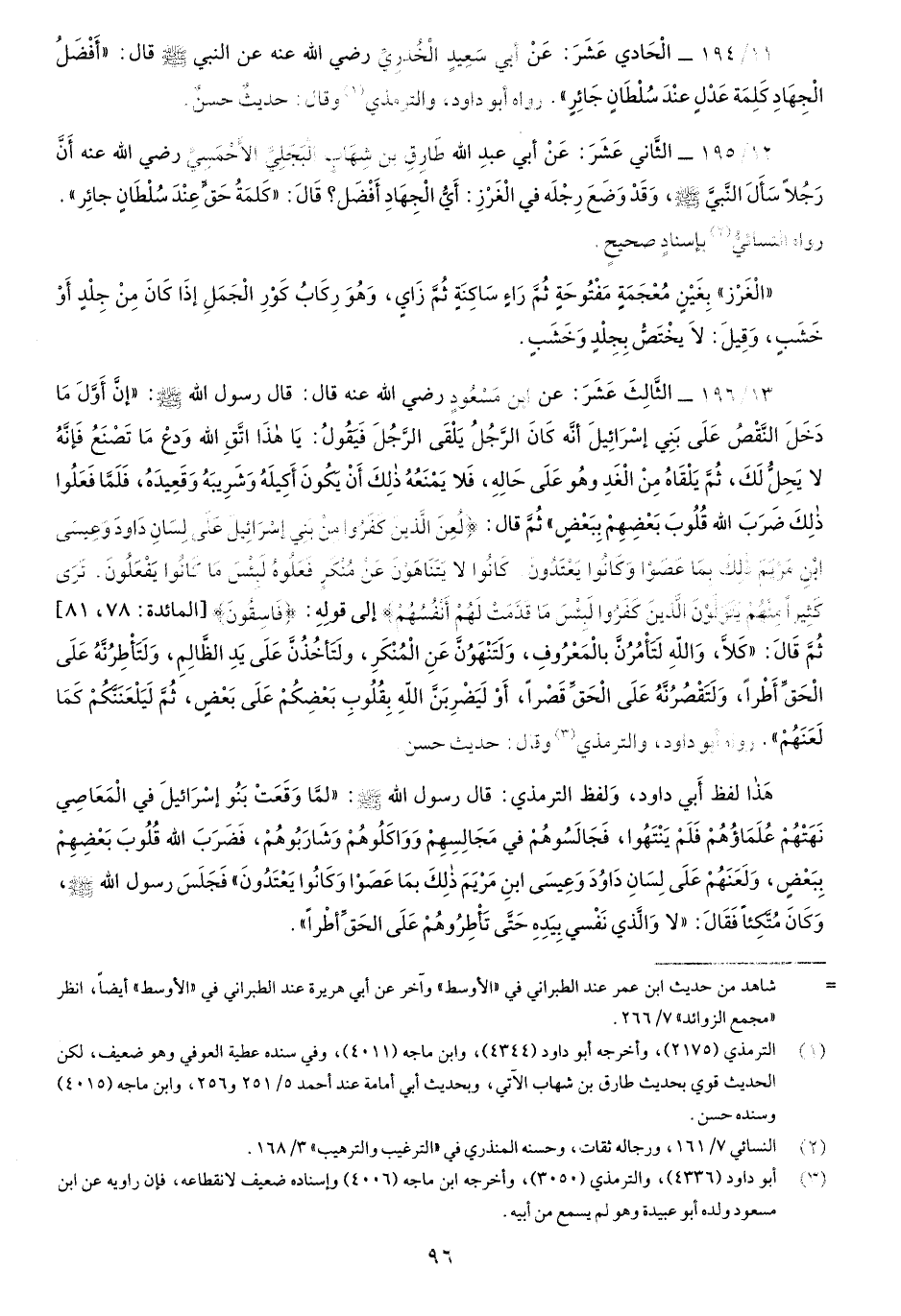 11/194- الْحَادي عشَرَ: عنْ أَبِي سَعيد الْخُدريِّ رضي اللَّه عنه عن النبيِّ صَلّى اللهُ عَلَيْهِ وسَلَّم قَالَ: "أَفْضَلُ الْجِهَادِ كَلِمَةُ عَدْلٍ عندَ سلْطَانٍ جائِرٍ "رواه أَبُو داود، والترمذي وَقالَ: حديثٌ حسنٌ.