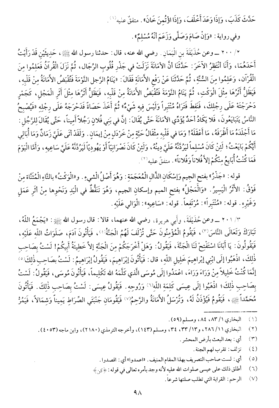 2/200- وعن حُذيْفَة بنِ الْيمانِ، رضي اللَّه عنه، قَالَ: حدثنا رسولُ اللَّه صَلّى اللهُ عَلَيْهِ وسَلَّم، حَديثْين قَدْ رَأَيْتُ أَحدهُمَا، وَأَنَا أَنْتظرُ الآخَرَ: حدَّثَنا أَنَّ الأَمَانَة نَزلتْ في جَذْرِ قُلُوبِ الرِّجَالِ، ثُمَّ نَزَلَ الْقُرآنُ فَعلموا مِنَ الْقُرْآن، وَعلِمُوا مِنَ السُّنَّةِ، ثُمَّ حَدَّثنا عَنْ رَفْعِ الأَمانَةِ فَقال: "يَنَامُ الرَّجل النَّوْمةَ فَتُقبضُ الأَمَانَةُ مِنْ قَلْبِهِ، فَيظلُّ أَثَرُهَا مِثْلَ الْوَكْتِ، ثُمَّ ينامُ النَّوْمَةَ فَتُقبضُ الأَمَانَةُ مِنْ قَلْبِهِ، فَيظَلُّ أَثَرُهَا مِثْل أثرِ الْمَجْلِ، كجَمْرٍ دَحْرجْتَهُ عَلَى رِجْلكَ، فَنفطَ فتَراه مُنْتبراً وَلَيْسَ فِيهِ شَيءٌ"ثُمَّ أَخذَ حَصَاةً فَدَحْرجَهَا عَلَى رِجْلِهِ، فَيُصْبحُ النَّاسُ يَتبايَعونَ، فَلا يَكادُ أَحَدٌ يُؤدِّي الأَمَانَةَ حَتَّى يُقَالَ: إِنَّ في بَنِي فَلانٍ رَجُلاً أَمِيناً، حَتَّى يُقَالَ لِلَّرجلِ: مَا أَجْلدهُ مَا أَظْرَفهُ، مَا أَعْقلَهُ، وَمَا في قلْبِهِ مِثْقَالُ حَبَّةٍ مِنْ خَرْدَلِ مِنْ إِيمانٍ. وَلَقَدْ أَتَى عَلَيَّ زَمَانٌ وَمَا أُبَالِي أَيُّكُمْ بايعْتُ، لَئِنْ كَانَ مُسْلماً ليردُنَّهُ عَليَّ دِينُه، ولَئِنْ كَانَ نَصْرانياً أَوْ يَهُوديًّا لَيُرُدنَّهُ عَلَيَّ سَاعِيه، وأَمَّا الْيَوْمَ فَما كُنْتُ أُبايُعُ مِنْكمْ إِلاَّ فُلاناً وَفلاناً "متفقٌ عَلَيهِ.
