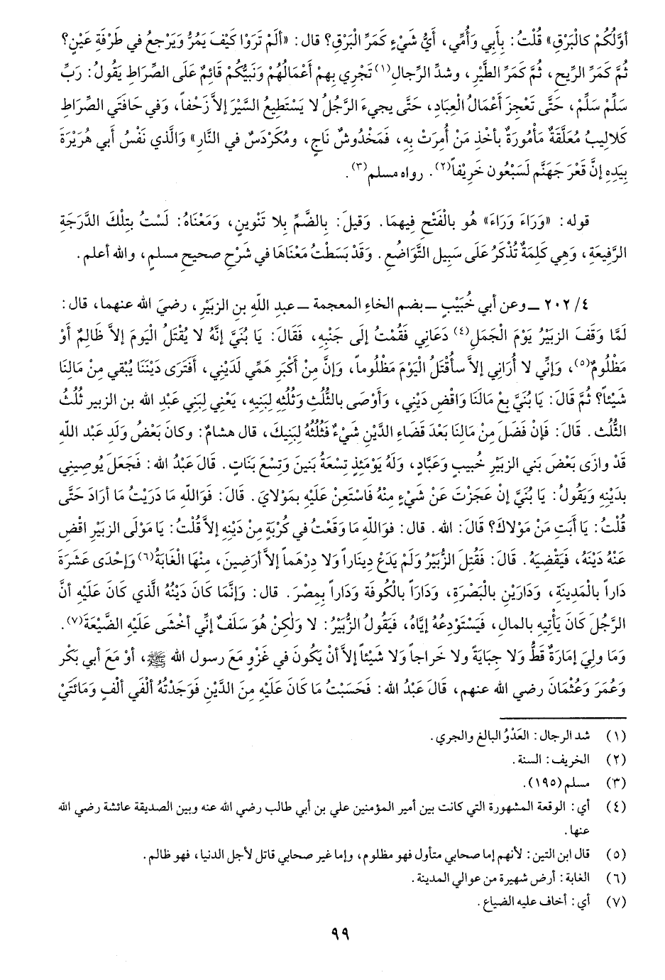 4/202- وعن أَبِي خُبَيْبٍ بضم الخاءِ المعجمة عبد اللَّهِ بنِ الزُّبَيْرِ، رضي اللَّه عنهما قَالَ: لَمَّا وَقَفَ الزبَيْرُ يَوْمَ الْجَمَلِ دَعانِي فَقُمْتُ إِلَى جَنْبِهِ، فَقَالَ: يَا بُنَيَّ إِنَّهُ لاَ يُقْتَلُ الْيَوْمَ إِلاَّ ظَالِمٌ أَوْ مَظْلُومٌ، وإِنِّي لاأُرَنِي إِلاَّ سَأُقْتَلُ الْيَومَ مَظْلُوماً، وَإِنَّ مِنْ أَكْبَرِ هَمِّي لَدَينْيِ أَفَتَرَى دَيْنَنَا يُبْقى مِنْ مالِنا شَيْئاً؟ ثُمَّ قَالَ: يا بني بعْ مَالَنَا واقْضِ دَيْنِي، وَأَوْصَى بالثُّلُثِ، وَثُلُثِهُ لِبَنِيهِ، يَعْنِي لبَنِي عَبْدِ اللَّه بن الزبير ثُلُثُ الثُّلُث. قَالَ: فَإِن فَضلِ مِنْ مالِنَا بعْدَ قَضَاءِ الدَّيْنِ شَيءٌ فثُلُثُهُ لِبَنِيك، قَالَ هِشَامٌ: وَكَانَ بَعْضُ وَلَدُ عَبْدِ اللَّهِ قَدْ وَازى بَعْضَ بَني الزبَيْرِ خُبيبٍ وَعَبَّادٍ، وَلَهُ يَوْمَئذٍ تَسْعَةُ بَنينَ وتِسعُ بَنَاتٍ. قَالَ عَبْدُ اللَّه: فَجَعَل يُوصِينِي بديْنِهِ وَيَقُول: يَا بُنَيَّ إِنْ عَجزْتَ عنْ شَيءٍ مِنْهُ فَاسْتَعِنْ عَلَيْهِ بموْلايَ. قَالَ: فَوَاللَّهِ مَا دَريْتُ مَا أرادَ حَتَّى قُلْتُ يَا أَبَتِ مَنْ مَوْلاَكَ؟ قَالَ: اللَّه. قَالَ: فَواللَّهِ مَا وَقَعْتُ في كُرْبَةٍ مِنْ دَيْنِهِ إِلاَّ قُلْتُ: يَا مَوْلَى الزبَيْرِ اقْضِ عَنْهُ دَيْنَهُ، فَيَقْضِيَهُ. قَالَ: فَقُتِلَ الزُّبَيْرُ وَلَمْ يَدَعْ دِينَاراً وَلاَ دِرْهَماً إِلاَّ أَرَضِينَ، مِنْهَا الْغَابَةُ وَإِحْدَى عَشَرَةَ دَاراً بالْمَدِينَةِ. وداريْن بالْبَصْرَةِ، وَدَارَاً بالْكُوفَة وَدَاراً بِمِصْرَ. قَالَ: وَإِنَّمَا كَانَ دَيْنُهُ الذي كَانَ عَلَيْهِ أَنَّ الرَّجُلَ يَأْتَيهِ بِالمالِ، فَيَسْتَودِعُهُ إِيَّاهُ، فَيَقُولُ الزُّبيْرُ: لا وَلَكنْ هُوَ سَلَفٌ إِنِّي أَخْشَى عَلَيْهِ الضَّيْعةَ. وَمَا ولِي إَمَارَةً قَطُّ وَلا جِبَايةً ولا خَراجاً وَلاَ شَيْئاً إِلاَّ أَنْ يَكُونَ في غَزْوٍ مَعَ رسولِ اللَّه صَلّى اللهُ عَلَيْهِ وسَلَّم، أَوْ مَعَ أَبِي بَكْر وَعُمَرَ وَعُثْمَانَ رضي اللَّه عنهم، قَالَ عَبْدُ اللَّه: فَحَسَبْتُ مَا كَانَ عَلَيْهِ مِنَ الدَّيْنِ فَوَجَدْتُهُ أَلْفَيْ أَلْفٍ وَمائَتَيْ
