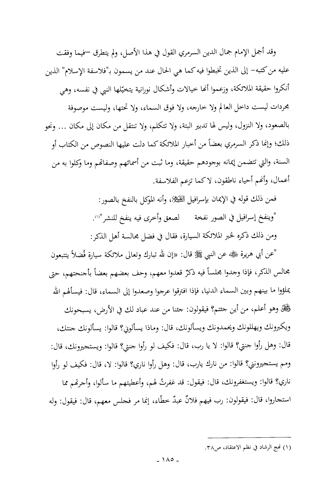 وقد أجمل الإمام جمال الدين السرمري القول في هذا الأصل، ولم يتطرق -فيما وفقت عليه من كتبه- إلى الذين تخبطوا فيه كما هي الحال عند من يسمون بـ"فلاسفة الإسلام" الذين أنكروا حقيقة الملائكة، وزعموا أنها خيالات وأشكال نورانية يتخيّلها النبي في نفسه، وهي مجردات ليست داخل العالم ولا خارجه، ولا فوق السماء، ولا تحتها، وليست موصوفة بالصعود، ولا النزول، وليس لها تدبير البتة، ولا تتكلم، ولا تنتقل من مكان إلى مكان ... ونحو ذلك؛ وإنما ذكر السرمري بعضاً من أخبار الملائكة كما دلت عليها النصوص من الكتاب أو السنة, والتي تتضمن إيمانه بوجودهم حقيقة، وما ثبت من أسمائهم وصفاتهم وما وكلوا به من أعمال، وأنهم أحياء ناطقون، لا كما تزعم الفلاسفة.
