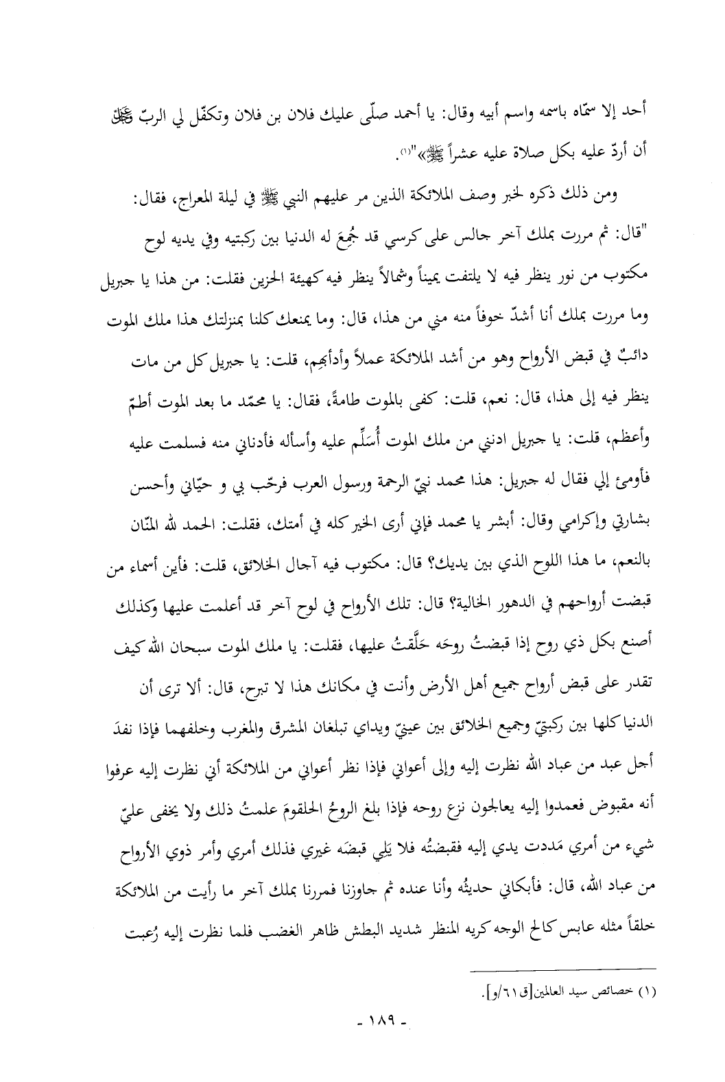 ومن ذلك ذكره لخبر وصف الملائكة الذين مر عليهم النبي - صلى الله عليه وسلم - في ليلة المعراج، فقال: "قال: ثم مررت بملك آخر جالس على كرسي قد جُمِعَ له الدنيا بين ركبتيه وفي يديه لوح مكتوب من نور ينظر فيه لا يلتفت يميناً وشمالاً ينظر فيه كهيئة الحزين فقلت: من هذا يا جبريل وما مررت بملك أنا أشدّ خوفاً منه مني من هذا, قال: وما يمنعك كلنا بمنزلتك هذا ملك الموت دائبٌ في قبض الأرواح وهو من أشد الملائكة عملاً وأدأبهِم, قلت: يا جبريل كل من مات ينظر فيه إلى هذا، قال: نعم، قلت: كفى بالموت طامةً، فقال: يا محمّد ما بعد الموت أطمّ وأعظم، قلت: يا جبريل ادنني من ملك الموت أُسَلِّم عليه وأسأله فأدناني منه فسلمت عليه فأومئ إلي فقال له جبريل: هذا محمد نبيّ الرحمة ورسول العرب فرحّب بي وحيّاني وأحسن بشارتي وإكرامي وقال: أبشر يا محمد فإني أرى الخير كله في أمتك, فقلت: الحمد لله المنّان بالنعم, ما هذا اللوح الذي بين يديك؟ قال: مكتوب فيه آجال الخلائق، قلت: فأين أسماء من قبضت أرواحهم في الدهور الخالية؟ قال: تلك الأرواح في لوح آخر قد أعلمت عليها وكذلك