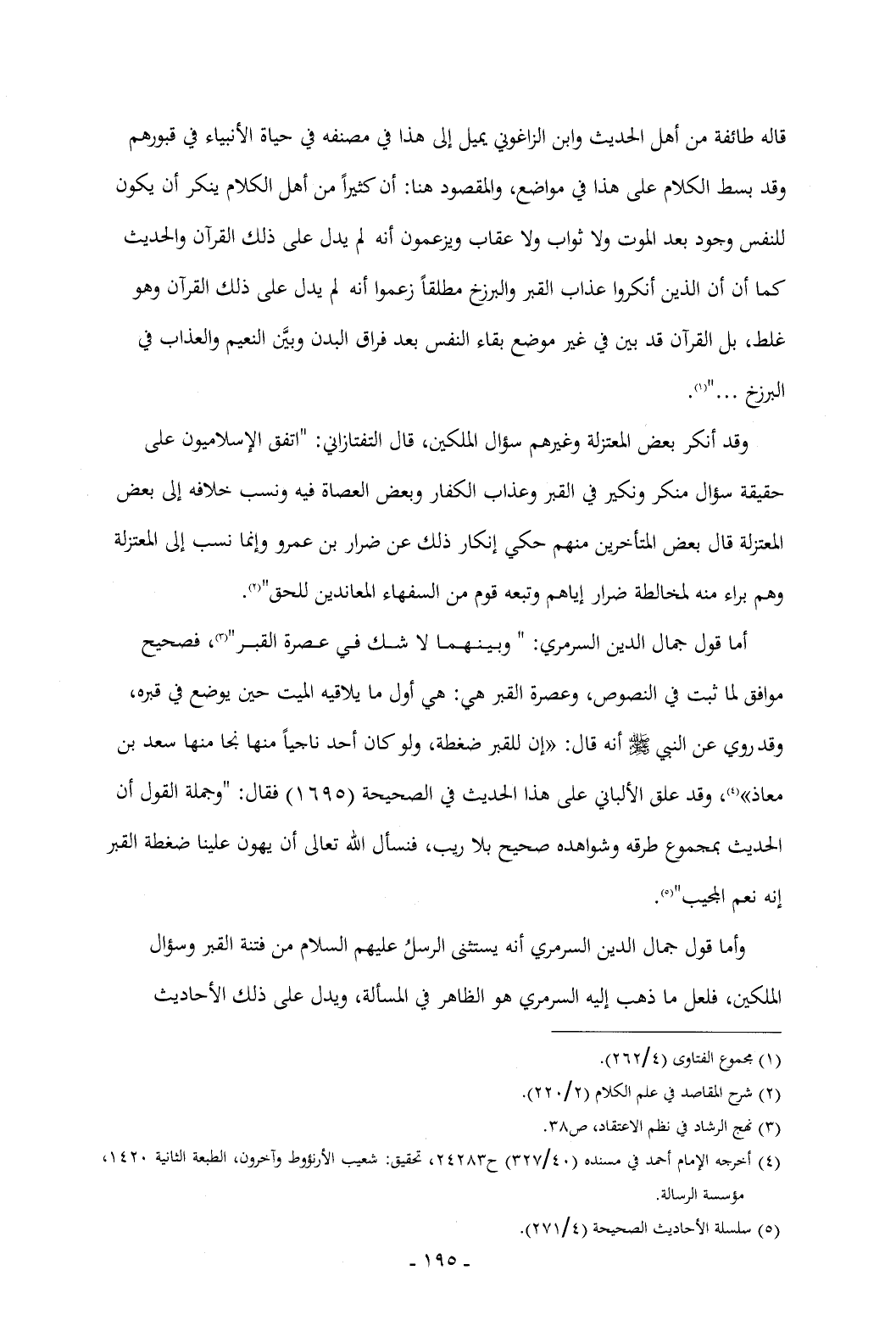قاله طائفة من أهل الحديث وابن الزاغوني يميل إلى هذا في مصنفه في حياة الأنبياء في قبورهم وقد بسط الكلام على هذا في مواضع، والمقصود هنا: أن كثيراً من أهل الكلام ينكر أن يكون للنفس وجود بعد الموت ولا ثواب ولا عقاب ويزعمون أنه لم يدل على ذلك القرآن والحديث كما أن أن الذين أنكروا عذاب القبر والبرزخ مطلقاً زعموا أنه لم يدل على ذلك القرآن وهو غلط، بل القرآن قد بين في غير موضع بقاء النفس بعد فراق البدن وبيَّن النعيم والعذاب في البرزخ ... " (¬1).