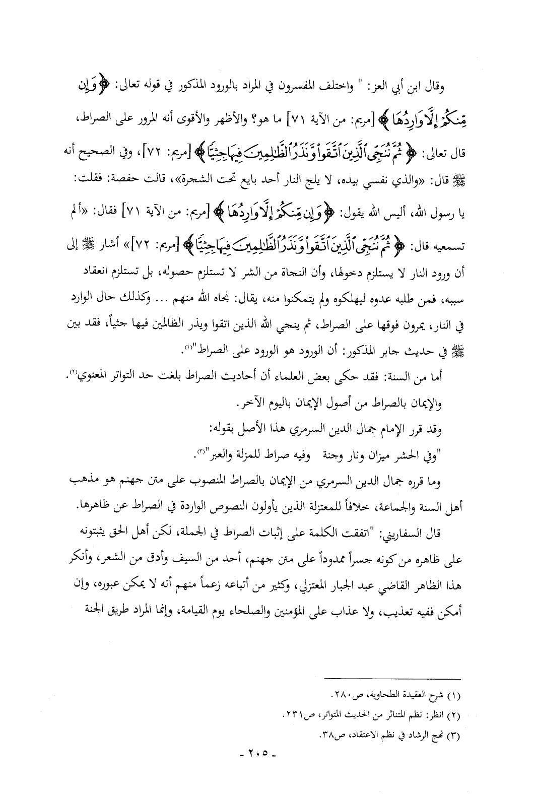 وقال ابن أبي العز: " واختلف المفسرون في المراد بالورود المذكور في قوله تعالى: {وَإِنْ مِنْكُمْ إِلَّا وَارِدُهَا} [مريم: من الآية 71] ما هو؟ والأظهر والأقوى أنه المرور على الصراط، قال تعالى: {ثُمَّ نُنَجِّي الَّذِينَ اتَّقَوْا وَنَذَرُ الظَّالِمِينَ فِيهَا جِثِيًّا} [مريم: 72]، وفي الصحيح أنه - صلى الله عليه وسلم - قال: «والذي نفسي بيده، لا يلج النار أحد بايع تحت الشجرة»، قالت حفصة: فقلت: يا رسول الله، أليس الله يقول: {وَإِنْ مِنْكُمْ إِلَّا وَارِدُهَا} [مريم: من الآية 71] فقال: «ألم تسمعيه قال: {ثُمَّ نُنَجِّي الَّذِينَ اتَّقَوْا وَنَذَرُ الظَّالِمِينَ فِيهَا جِثِيًّا} [مريم: 72]» أشار - صلى الله عليه وسلم - إلى أن ورود النار لا يستلزم دخولها، وأن النجاة من الشر لا تستلزم حصوله، بل تستلزم انعقاد سببه، فمن طلبه عدوه ليهلكوه ولم يتمكنوا منه، يقال: نجاه الله منهم ... وكذلك حال الوارد في النار، يمرون فوقها على الصراط، ثم ينجي الله الذين اتقوا ويذر الظالمين فيها جثياً، فقد بين - صلى الله عليه وسلم - في حديث جابر المذكور: أن الورود هو الورود على الصراط" (¬1).