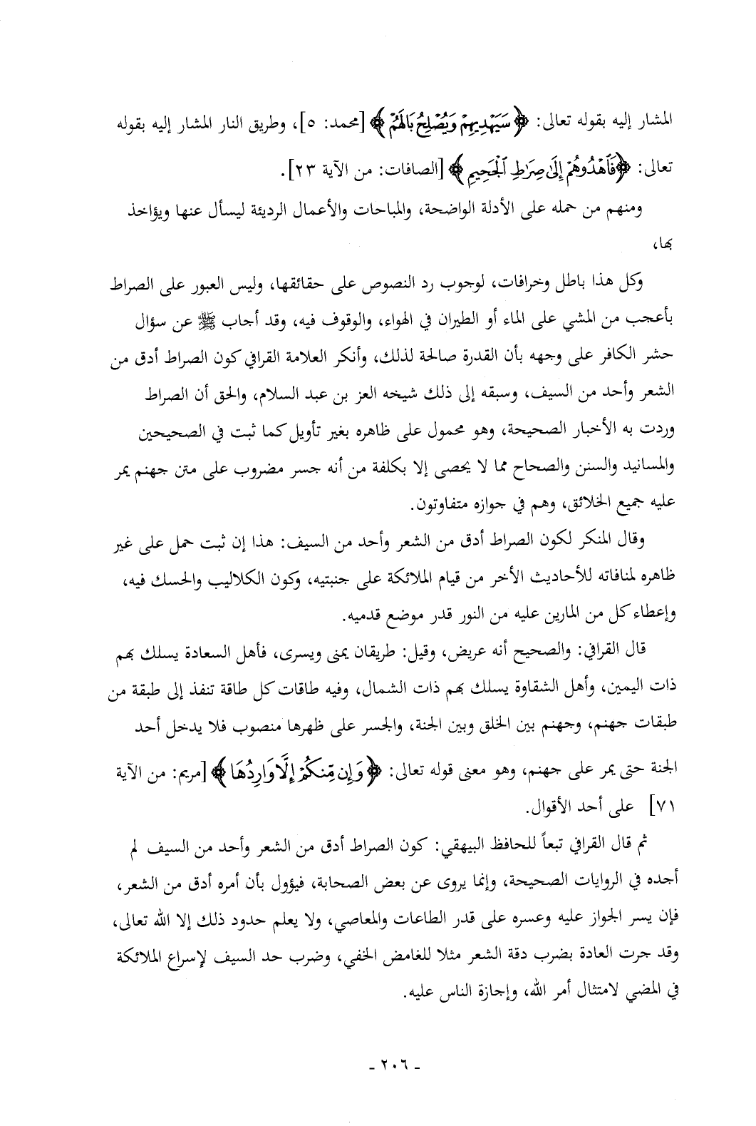وكل هذا باطل وخرافات، لوجوب رد النصوص على حقائقها، وليس العبور على الصراط بأعجب من المشي على الماء أو الطيران في الهواء، والوقوف فيه، وقد أجاب - صلى الله عليه وسلم - عن سؤال حشر الكافر على وجهه بأن القدرة صالحة لذلك، وأنكر العلامة القرافي كون الصراط أدق من الشعر وأحد من السيف، وسبقه إلى ذلك شيخه العز بن عبد السلام، والحق أن الصراط وردت به الأخبار الصحيحة، وهو محمول على ظاهره بغير تأويل كما ثبت في الصحيحين والمسانيد والسنن والصحاح مما لا يحصى إلا بكلفة من أنه جسر مضروب على متن جهنم يمر عليه جميع الخلائق، وهم في جوازه متفاوتون.