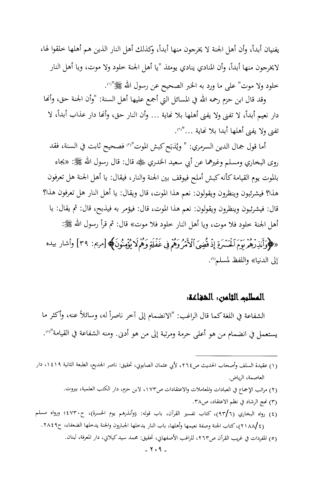 أما قول جمال الدين السرمري: " ويُذبَح كبش الموت" (¬3) فصحيح ثابت في السنة، فقد روى البخاري ومسلم وغيرهما عن أبي سعيد الخدري - رضي الله عنه - قال: قال رسول الله - صلى الله عليه وسلم -: «يجاء