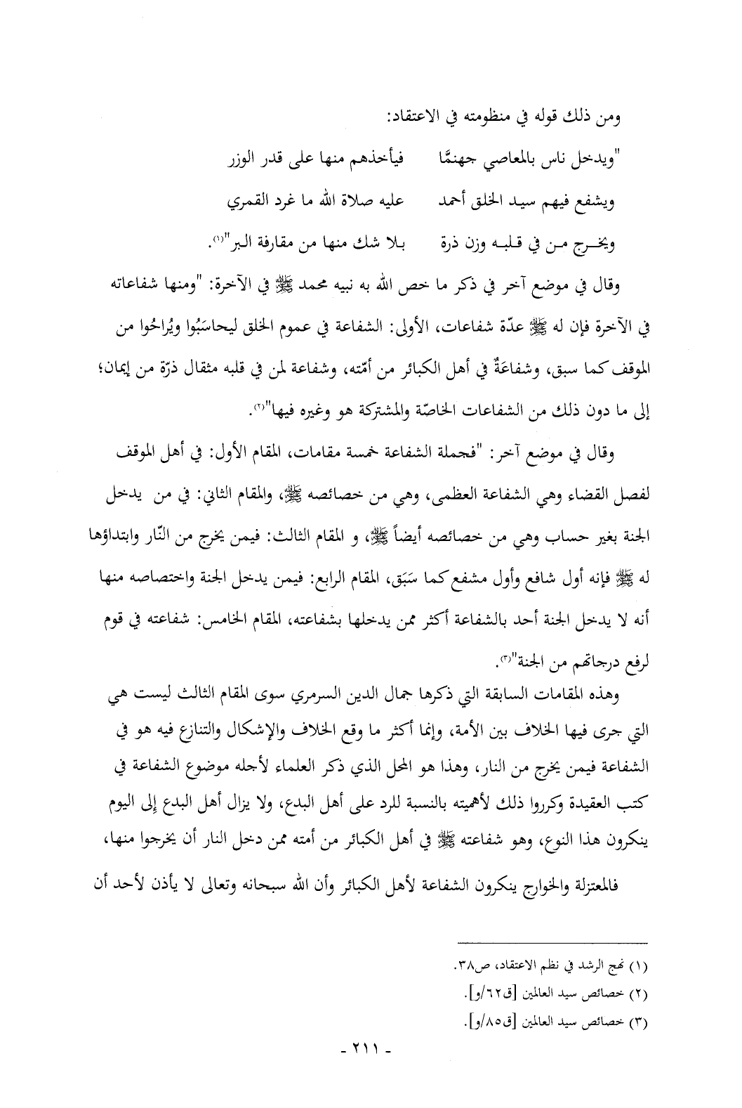 وقال في موضع آخر في ذكر ما خص الله به نبيه محمد - صلى الله عليه وسلم - في الآخرة: "ومنها شفاعاته في الآخرة فإن له - صلى الله عليه وسلم - عدّة شفاعات، الأولى: الشفاعة في عموم الخلق ليحاسَبُوا ويُراحُوا من الموقف كما سبق، وشفاعَةٌ في أهل الكبائر من أمّته، وشفاعة لمن في قلبه مثقال ذرّة من إيمان؛