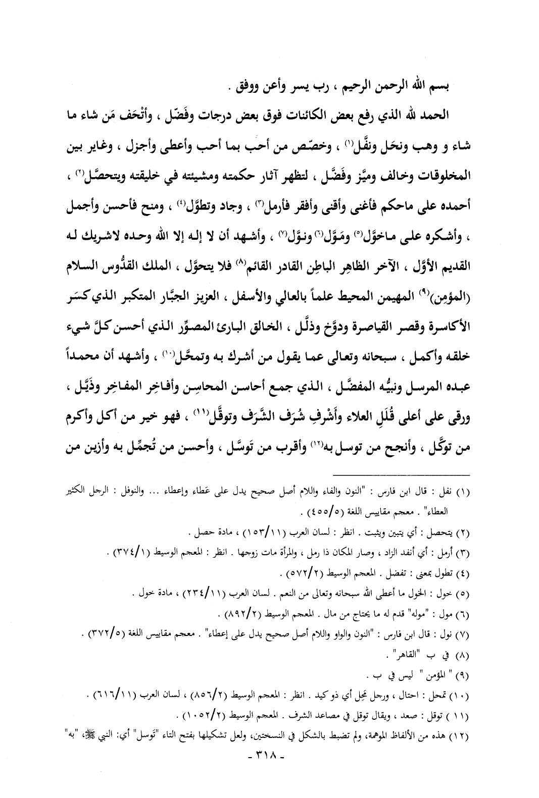 الحمد لله الذي رفع بعض الكائنات فوق بعض درجات وفَضّل , وأتْحَف مَن شاء ما شاء ووهب ونحَل ونفَّل (¬1) , وخصّص من أحب بما أحب وأعطى وأجزل , وغاير بين المخلوقات وخالف وميَّز وفَضَّل , لتظهر آثار حكمته ومشيئته في خليقته ويتحصَّل (¬2) , أحمده على ماحكم فأغنى وأقنى وأفقر فأرمل (¬3) , وجاد وتطوَّل (¬4) , ومنح فأحسن وأجمل , وأشكره على ماخوَّل (¬5) ومَوَّل (¬6) ونوَّل (¬7) , وأشهد أن لا إله إلا الله وحده لاشريك له القديم الأوَّل , الآخر الظاهِر الباطِن القادر القائم (¬8) فلا يتحوَّل , الملك القدُّوس السلام (المؤمِن) (¬9) المهيمن المحيط علماً بالعالي والأسفل , العزيز الجبَّار المتكبر الذي كسَر الأكاسرة وقصر القياصرة ودوَّخ وذلَّل , الخالق البارئ المصوِّر الذي أحسن كلَّ شيء خلقه وأكمل , سبحانه وتعالى عما يقول من أشرك به وتمحَّل (¬10) , وأشهد أن محمداً عبده المرسل ونبيُّه المفضَّل , الذي جمع أحاسن المحاسِن وأفاخِر المفاخِر وذَيَّل , ورقى على أعلى قُلَلِ العلاء وأَشْرفِ شُرَف الشَّرَف وتوقَّل (¬11) , فهو خير
