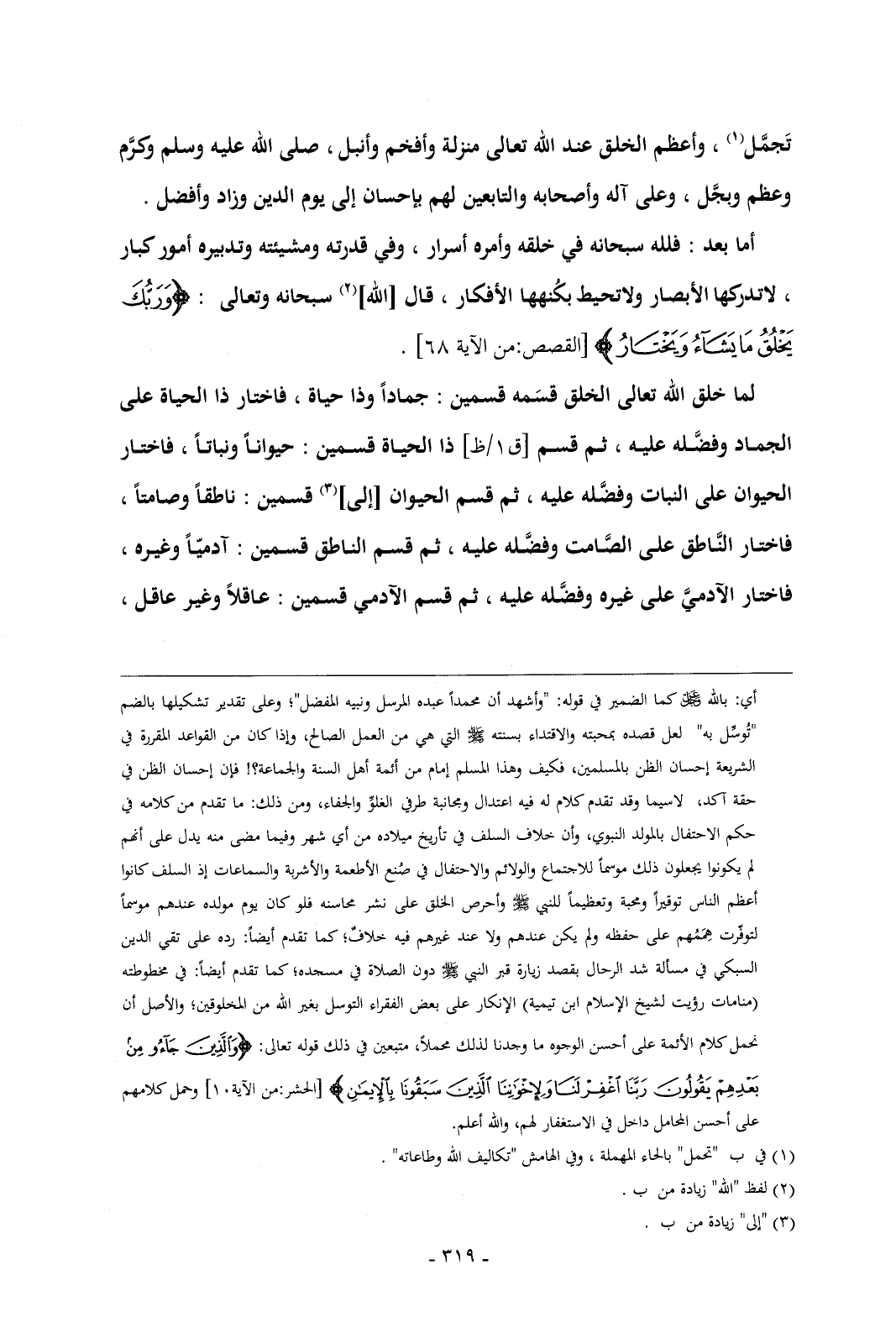 لما خلق الله تعالى الخلق قسَمه قسمين: جماداً وذا حياة , فاختار ذا الحياة على الجماد وفضَّله عليه , ثم قسم [ق 1/ظ] ذا الحياة قسمين: حيواناً ونباتاً , فاختار الحيوان على النبات وفضَّله عليه , ثم قسم الحيوان [إلى] (¬3) قسمين: ناطقاً وصامتاً ,
