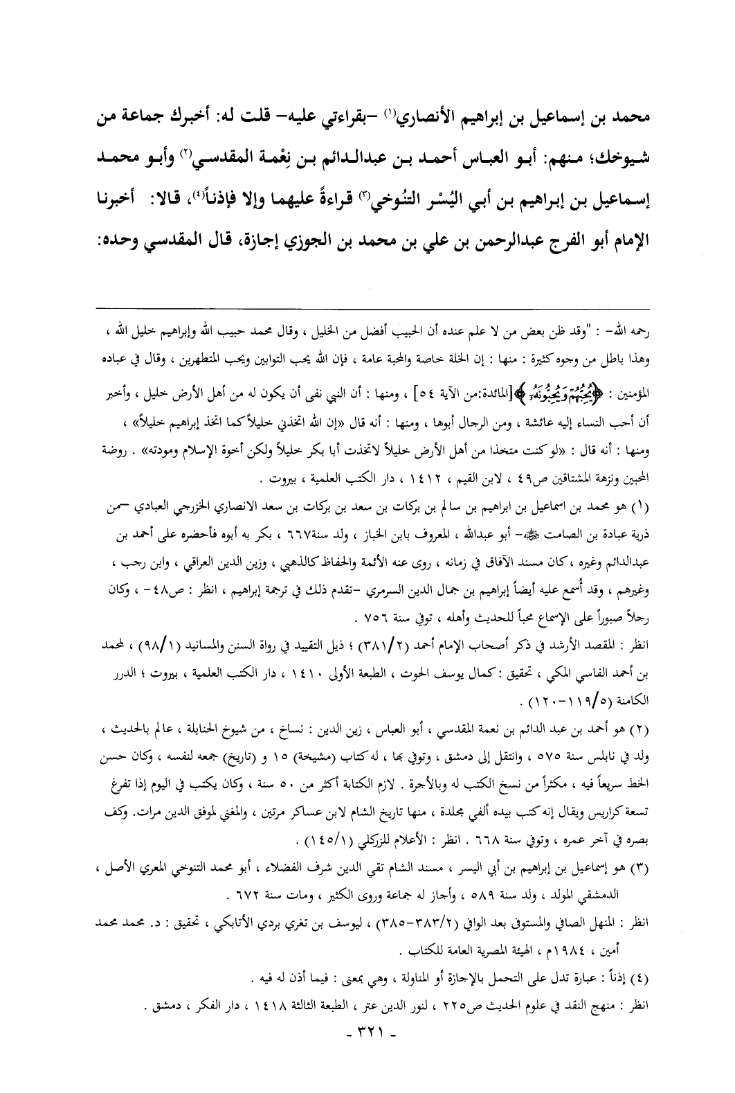 الإمام أبو الفرج عبدالرحمن بن علي بن محمد بن الجوزي إجازة, قال المقدسي وحده: