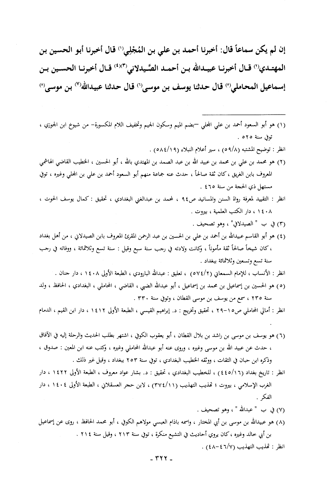 إن لم يكن سماعاً قال: أخبرنا أحمد بن علي بن المُجْلِي (¬1) قال أخبرنا أبو الحسين بن المهتدي (¬2) قال أخبرنا عبيدالله بن أحمد الصَّيدلاني (¬3) (¬4) قال أخبرنا الحسين بن إسماعيل المحاملي (¬5) قال حدثنا يوسف بن موسى (¬6) قال حدثنا عبيدالله (¬7) بن موسى (¬8)