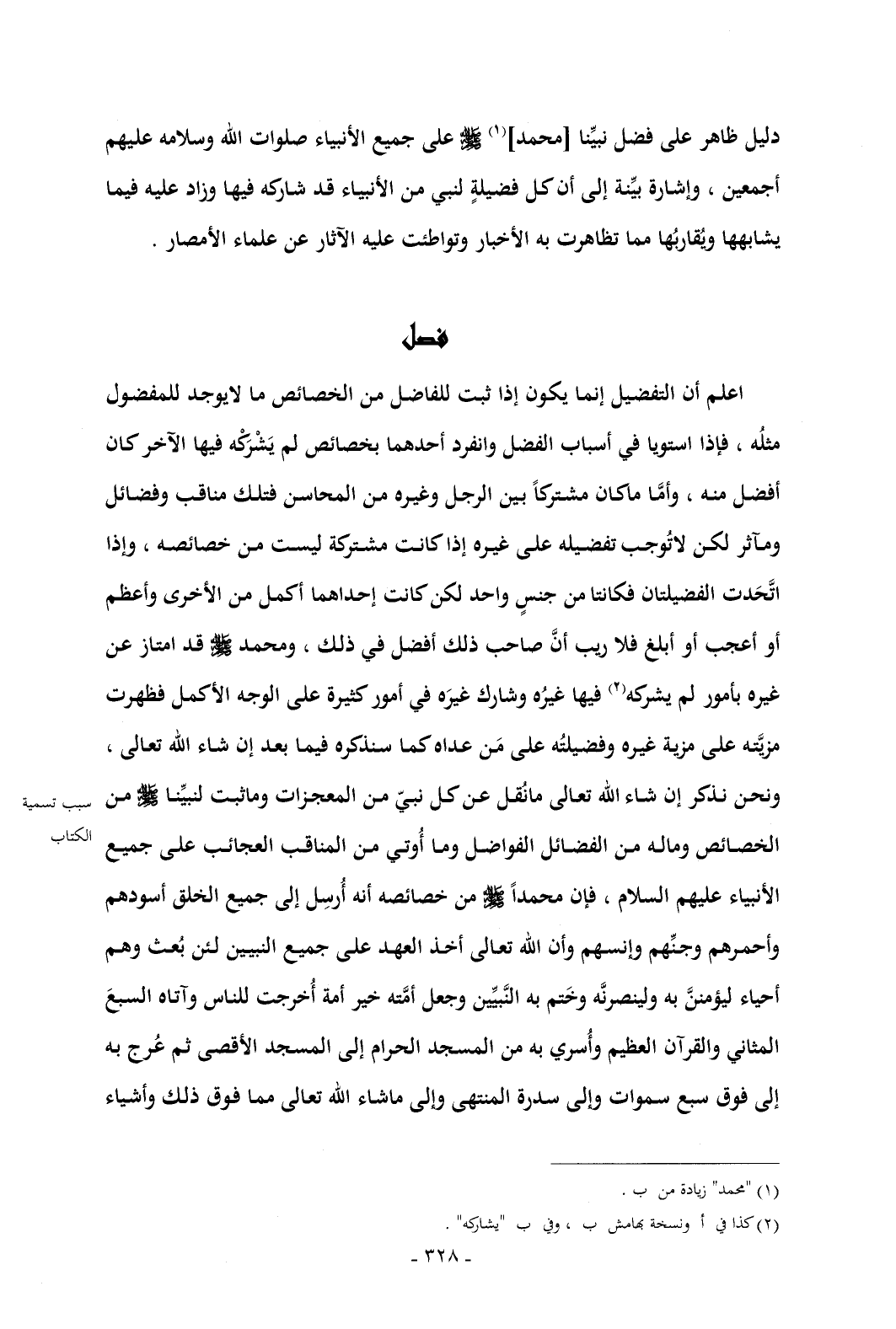 اعلم أن التفضيل إنما يكون إذا ثبت للفاضل من الخصائص ما لايوجد للمفضول مثلُه , فإذا استويا في أسباب الفضل وانفرد أحدهما بخصائص لم يَشْرَكْه فيها الآخر كان أفضل منه , وأمَّا ماكان مشتركاً بين الرجل وغيره من المحاسن فتلك مناقب وفضائل ومآثر لكن لاتُوجب تفضيله على غيره إذا كانت مشتركة ليست من خصائصه , وإذا اتَّحَدت الفضيلتان فكانتا من جنسٍ واحد لكن كانت إحداهما أكمل من الأخرى وأعظم أو أعجب أو أبلغ فلا ريب أنَّ صاحب ذلك أفضل في ذلك , ومحمد - صلى الله عليه وسلم - قد امتاز عن غيره بأمور لم يشركه (¬2) فيها غيرُه وشارك غيرَه في أمور كثيرة على الوجه الأكمل فظهرت مزيَّته على مزية غيره وفضيلتُه على مَن عداه كما سنذكره فيما بعد إن شاء الله تعالى , ونحن نذكر إن شاء الله تعالى مانُقل عن كل نبيّ من المعجزات وماثبت لنبيِّنا - صلى الله عليه وسلم - من الخصائص وماله من الفضائل الفواضل وما أُوتي من المناقب العجائب على جميع الأنبياء عليهم السلام , فإن محمداً - صلى الله عليه وسلم - من خصائصه أنه أُرسِل إلى جميع الخلق أسودهم وأحمرهم وجنِّهم وإنسهم وأن الله تعالى أخذ العهد على جميع النبيين لئن بُعث وهم