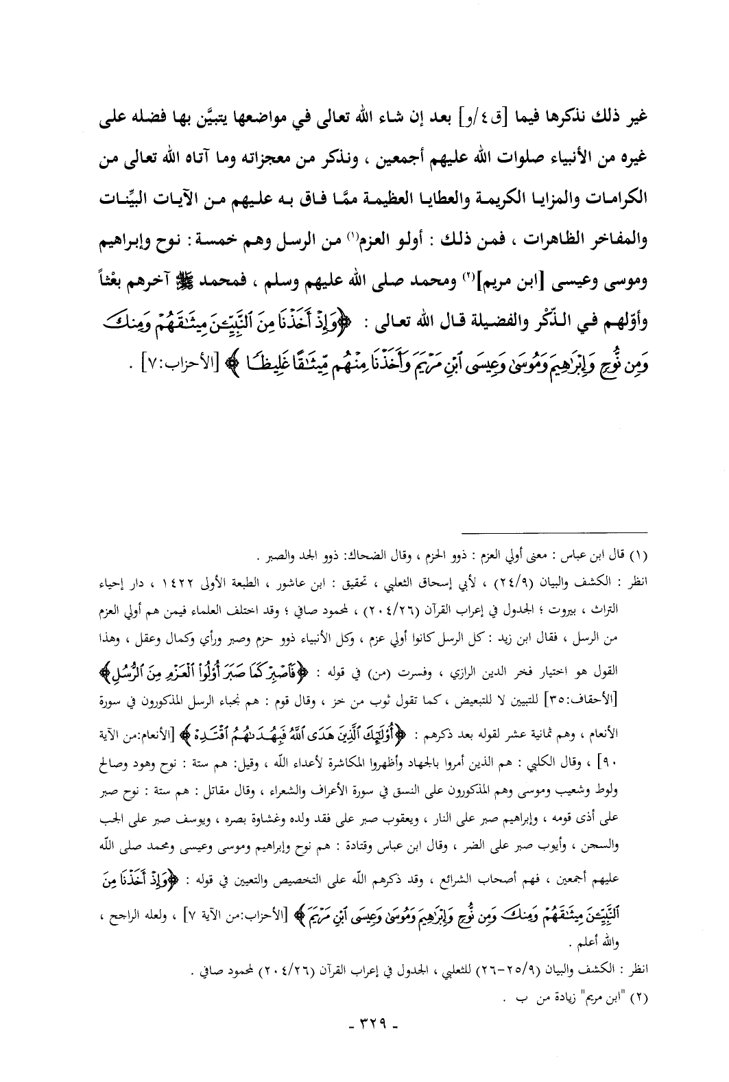 انظر: الكشف والبيان (9/ 24) , لأبي إسحاق الثعلبي , تحقيق: ابن عاشور , الطبعة الأولى 1422 , دار إحياء التراث , بيروت؛ الجدول في إعراب القرآن (26/ 204) , لمحمود صافي؛ وقد اختلف العلماء فيمن هم أولي العزم من الرسل , فقال ابن زيد: كل الرسل كانوا أولي عزم، وكل الأنبياء ذوو حزم وصبر ورأي وكمال وعقل , وهذا القول هو اختيار فخر الدين الرازي , وفسرت (من) في قوله: {فَاصْبِرْ كَمَا صَبَرَ أُولُو الْعَزْمِ مِنَ الرُّسُلِ} [الأحقاف: 35] للتبيين لا للتبعيض، كما تقول ثوب من خز , وقال قوم: هم نجباء الرسل المذكورون في سورة الأنعام , وهم ثمانية عشر لقوله بعد ذكرهم: {أُولَئِكَ الَّذِينَ هَدَى اللَّهُ فَبِهُدَاهُمُ اقْتَدِهْ} [الأنعام: من الآية 90] , وقال الكلبي: هم الذين أمروا بالجهاد وأظهروا المكاشرة لأعداء الله , وقيل: هم ستة: نوح وهود وصالح ولوط وشعيب وموسى وهم المذكورون على النسق في سورة الأعراف والشعراء , وقال مقاتل: هم ستة: نوح صبر على أذى قومه، وإبراهيم صبر على النار، ويعقوب صبر على فقد ولده وغشاوة بصره، ويوسف صبر على الجب والسجن، وأيوب صبر على الضر , وقال ابن عباس وقتادة: هم نوح وإبراهيم وموسى وعيسى ومحمد صلى الله عليهم أجمعين، فهم أصحاب الشرائع، وقد ذكرهم الله على التخصيص والتعيين في قوله: {وَإِذْ أَخَذْنَا مِنَ النَّبِيِّينَ مِيثَاقَهُمْ وَمِنْكَ وَمِنْ نُوحٍ وَإِبْرَاهِيمَ وَمُوسَى وَعِيسَى ابْنِ مَرْيَمَ} [الأحزاب: من الآية 7] , ولعله الراجح , والله أعلم.