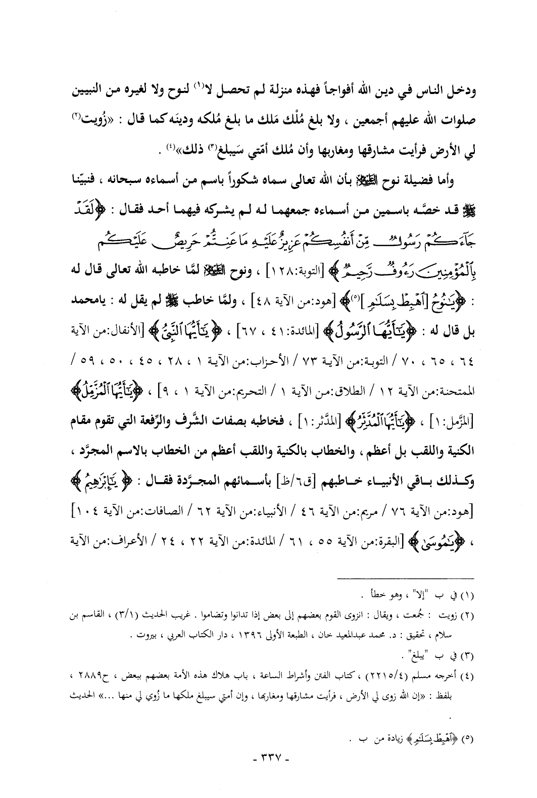 وأما فضيلة نوح - عليه السلام - بأن الله تعالى سماه شكوراً باسم من أسماءه سبحانه , فنبيّنا - صلى الله عليه وسلم - قد خصَّه باسمين من أسماءه جمعهما له لم يشركه فيهما أحد فقال: {لَقَدْ جَاءَكُمْ رَسُولٌ مِنْ أَنْفُسِكُمْ عَزِيزٌ عَلَيْهِ مَا عَنِتُّمْ حَرِيصٌ عَلَيْكُمْ بِالْمُؤْمِنِينَ رَءُوفٌ رَحِيمٌ} [التوبة: 128] , ونوح - عليه السلام - لمَّا خاطبه الله تعالى قال له: {يَانُوحُ [اهْبِطْ بِسَلَامٍ] (¬5)} [هود: من الآية 48] , ولمَّا خاطب - صلى الله عليه وسلم - لم يقل له: يامحمد بل قال له: {يَاأَيُّهَا الرَّسُولُ} [المائدة: 41 , 67] , {يَاأَيُّهَا النَّبِيُّ} [الأنفال: من الآية 64 , 65 , 70 / التوبة: من الآية 73 / الأحزاب: من الآية 1 , 28 , 45 , 50 , 59 / الممتحنة: من الآية 12 / الطلاق: من الآية 1 / التحريم: من الآية 1 , 9] , {يَاأَيُّهَا الْمُزَّمِّلُ} [المزَّمل: 1] , {يَاأَيُّهَا الْمُدَّثِّرُ} [المدَّثر: 1] , فخاطبه بصفات الشَّرف والرِّفعة التي تقوم مقام الكنية واللقب بل أعظم , والخطاب بالكنية واللقب أعظم من