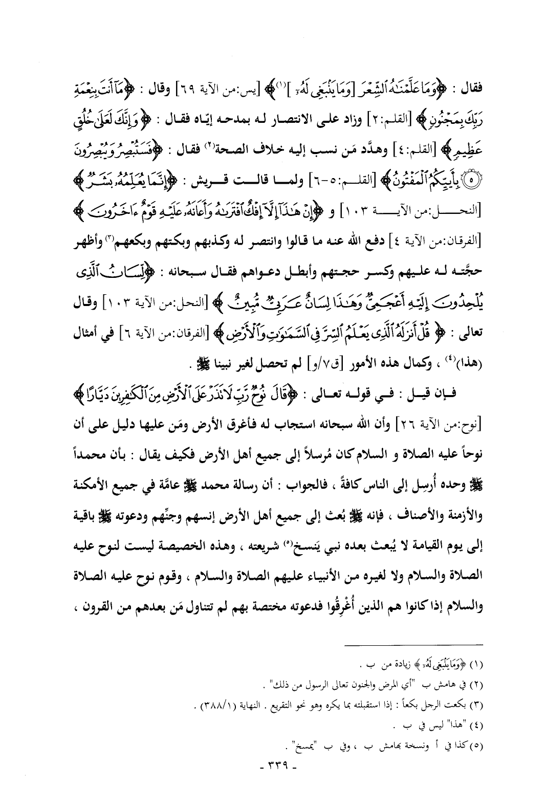 فقال: {وَمَا عَلَّمْنَاهُ الشِّعْرَ [وَمَا يَنْبَغِي لَهُ] (¬1)} [يس: من الآية 69] وقال: {مَا أَنْتَ بِنِعْمَةِ رَبِّكَ بِمَجْنُونٍ} [القلم: 2] وزاد على الانتصار له بمدحه إيّاه فقال: {وَإِنَّكَ لَعَلَى خُلُقٍ عَظِيمٍ} [القلم: 4] وهدَّد مَن نسب إليه خلاف الصحة (¬2) فقال: {فَسَتُبْصِرُ وَيُبْصِرُونَ (5) بِأَيِّكُمُ الْمَفْتُونُ} [القلم: 5 - 6] ولما قالت قريش: {إِنَّمَا يُعَلِّمُهُ بَشَرٌ} [النحل: من الآية 103] و {إِنْ هَذَا إِلَّا إِفْكٌ افْتَرَاهُ وَأَعَانَهُ عَلَيْهِ قَوْمٌ آخَرُونَ} [الفرقان: من الآية 4] دفع الله عنه ما قالوا وانتصر له وكذبهم وبكتهم وبكعهم (¬3) وأظهر حجَّته له عليهم وكسر حجتهم وأبطل دعواهم فقال سبحانه: {لِسَانُ الَّذِي يُلْحِدُونَ إِلَيْهِ أَعْجَمِيٌّ وَهَذَا لِسَانٌ عَرَبِيٌّ مُبِينٌ} [النحل: من الآية 103] وقال تعالى: {قُلْ أَنْزَلَهُ الَّذِي يَعْلَمُ السِّرَّ فِي السَّمَاوَاتِ وَالْأَرْضِ} [الفرقان: من الآية 6] في أمثال (هذا) (¬4) , وكمال هذه الأمور [ق 7/و] لم تحصل لغير نبينا - صلى الله عليه وسلم -.