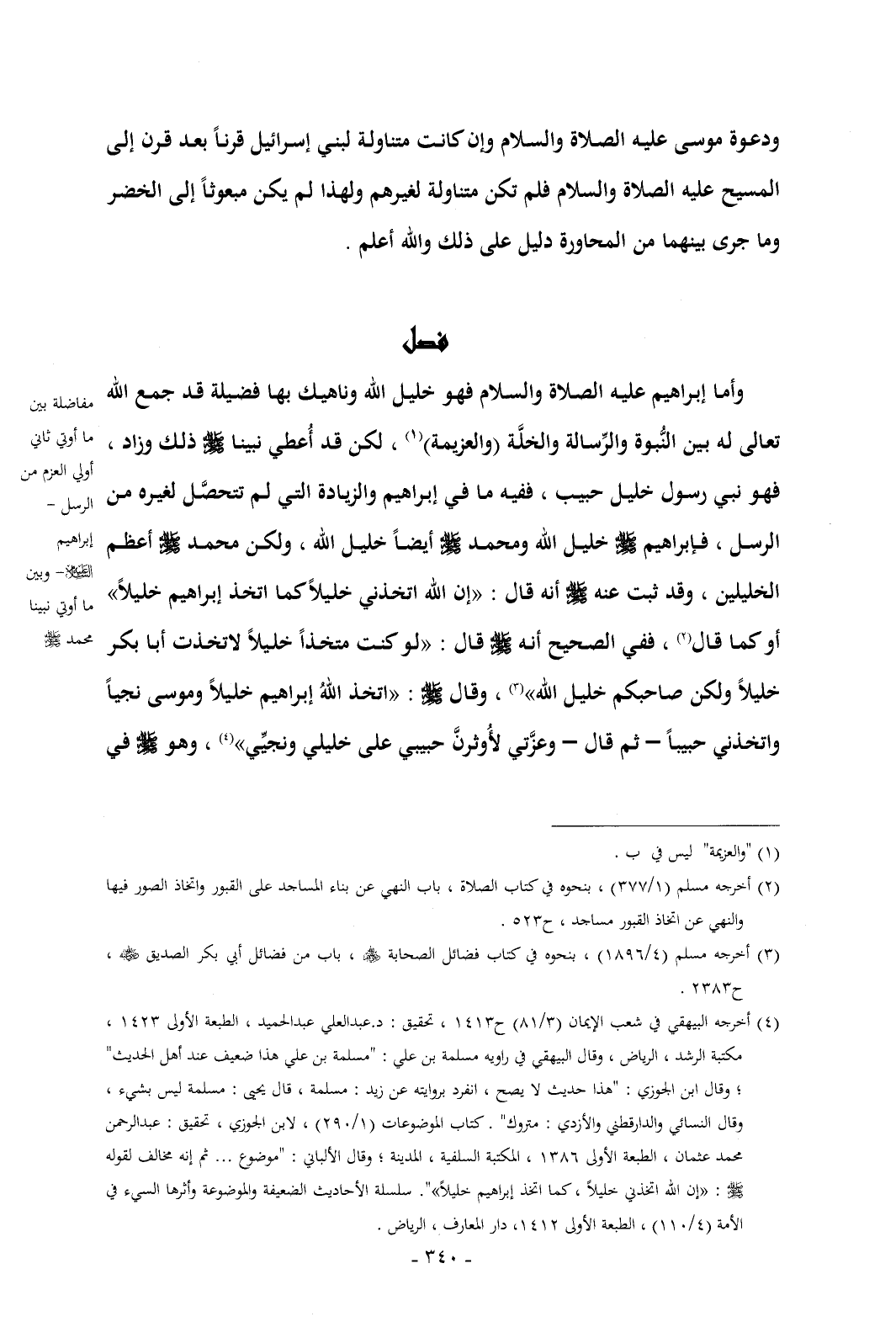 وأما إبراهيم عليه الصلاة والسلام فهو خليل الله وناهيك بها فضيلة قد جمع الله تعالى له بين النُّبوة والرِّسالة والخلَّة (والعزيمة) (¬1) , لكن قد أُعطي نبينا - صلى الله عليه وسلم - ذلك وزاد , فهو نبي رسول خليل حبيب , ففيه ما في إبراهيم والزيادة التي لم تتحصَّل لغيره من الرسل , فإبراهيم - صلى الله عليه وسلم - خليل الله ومحمد - صلى الله عليه وسلم - أيضاً خليل الله , ولكن محمد - صلى الله عليه وسلم - أعظم الخليلين , وقد ثبت عنه - صلى الله عليه وسلم - أنه قال: «إن الله اتخذني خليلاً كما اتخذ إبراهيم خليلاً» أو كما قال (¬2) , ففي الصحيح أنه - صلى الله عليه وسلم - قال: «لو كنت متخذاً خليلاً لاتخذت أبا بكر خليلاً ولكن صاحبكم خليل الله» (¬3) , وقال - صلى الله عليه وسلم -: «اتخذ اللهُ إبراهيم خليلاً وموسى نجياً واتخذني حبيباً - ثم قال - وعزَّتي لأُوثرنَّ حبيبي على خليلي ونجيِّي» (¬4) , وهو - صلى الله عليه وسلم - في