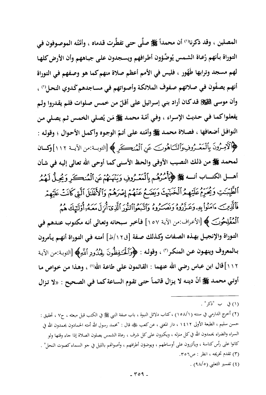 (¬2) أخرج الدارمي في سننه (1/ 158) , كتاب دلائل النبوة , باب صفة النبي - صلى الله عليه وسلم - في الكتب قبل مبعثه , ح 7 , تحقيق: حسن سليم , الطبعة الأولى 1412 , دار المغني , عن كعب - رضي الله عنه - قال: "محمد رسول الله أمته الحمادون يحمدون الله في السراء والضراء يحمدون الله في كل منزله , ويكبرون على كل شرف , رعاة الشمس يصلون الصلاة إذا جاء وقتها ولو كانوا على رأس كناسة , ويأتزرون على أوساطهم , ويوضؤن أطرافهم , وأصواتهم بالليل في جو السماء كصوت النحل".