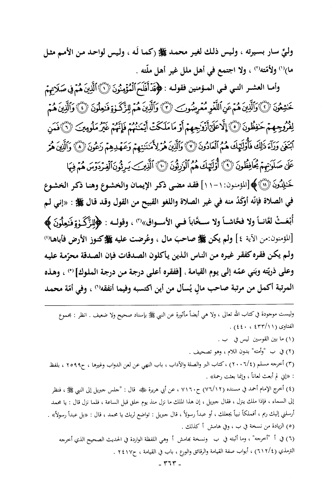 عليه وعلى ذريّته وبَني عمّه إلى يوم القيامة , [ففقره أعلى درجة من درجة الملوك] (¬5) , وهذه المرتبة أكمل من مرتبة صاحب مالٍ يُسأل من أين اكتسبه وفيما أنفقه (¬6) , وفي أمّة محمد