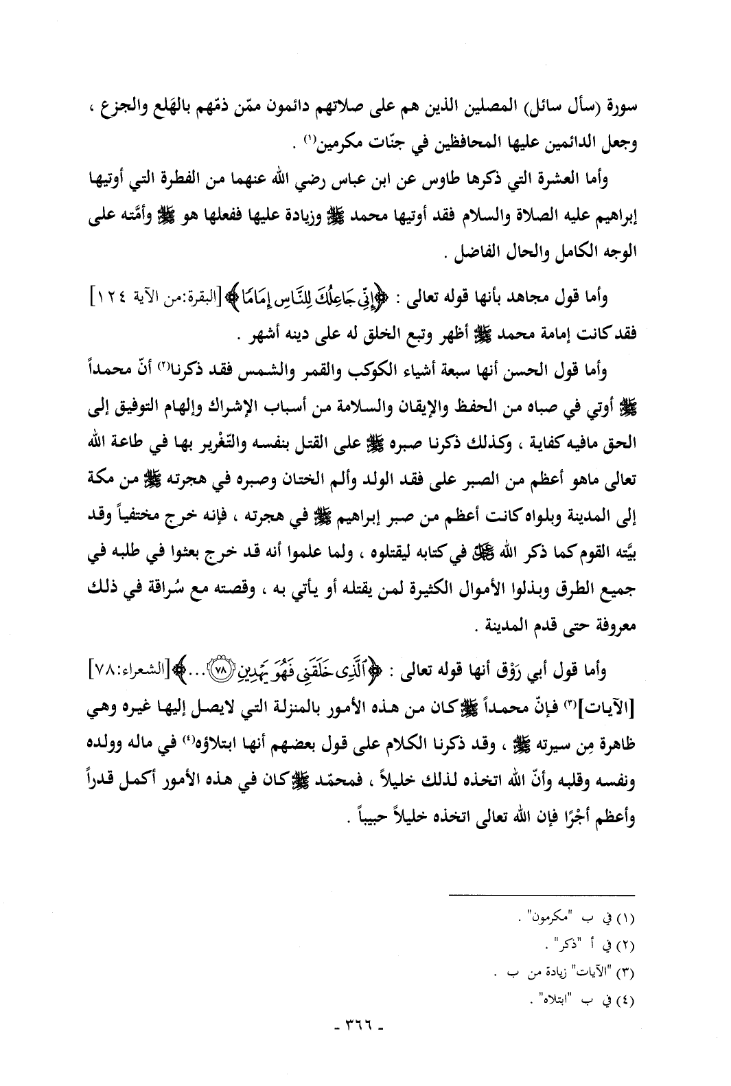 وأما قول أبي رَوْق أنها قوله تعالى: {الَّذِي خَلَقَنِي فَهُوَ يَهْدِينِ (78) ... } [الشعراء: 78] [الآيات] (¬3) فإنّ محمداً - صلى الله عليه وسلم - كان من هذه الأمور بالمنزلة التي لايصل إليها غيره وهي ظاهرة مِن سيرته - صلى الله عليه وسلم - , وقد ذكرنا الكلام على قول بعضهم أنها ابتلاؤه (¬4) في ماله وولده ونفسه وقلبه وأنّ الله اتخذه لذلك خليلاً , فمحمّد - صلى الله عليه وسلم - كان في هذه الأمور أكمل قدراً وأعظم أجْرًا فإن الله تعالى اتخذه خليلاً حبيباً.