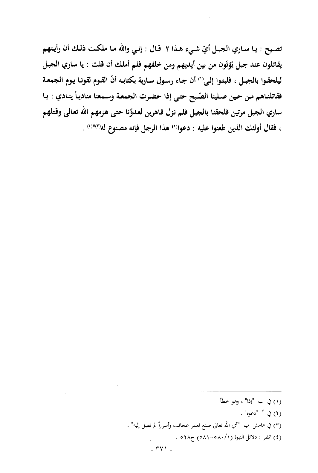 تصيح: يا ساري الجبل أيّ شيء هذا؟ قال: إني والله ما ملكت ذلك أن رأيتهم يقاتلون عند جبل يُؤتَون من بين أيديهم ومن خلفهم فلم أملك أن قلت: يا ساري الجبل ليلحقوا بالجبل , فلبثوا إلى (¬1) أن جاء رسول سارية بكتابه أنّ القوم لقونا يوم الجمعة فقاتلناهم من حين صلينا الصّبح حتى إذا حضرت الجمعة وسمعنا منادياً ينادي: يا ساري الجبل مرتين فلحقنا بالجبل فلم نزل قاهرين لعدوِّنا حتى هزمهم الله تعالى وقتلهم , فقال أولئك الذين طعنوا عليه: دعوا (¬2) هذا الرجل فإنه مصنوع له (¬3) " (¬4).