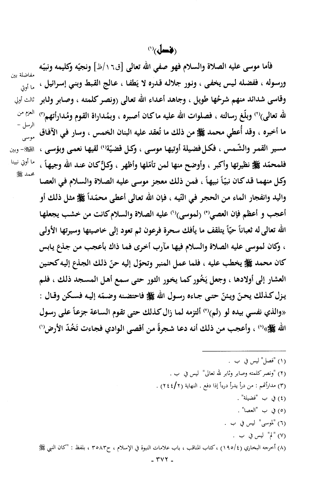 فأما موسى عليه الصلاة والسلام فهو صفي الله تعالى [ق 16/ظ] ونجيّه وكليمه ونبيّه ورسوله , ففضله ليس يخفى , ونور جلاله قدره لا يَطفا , عالج القبط وبني إسرائيل , وقاسى شدائد منهم شرحُها طويل , وجاهد أعداء الله تعالى (ونصر كلمته , وصابر وثابر لله تعالى) (¬2) وبلّغ رسالته , فصلوات الله عليه ما كان أصبره , وبمُداراة القوم ومُدارأتهم (¬3) ما أخبره , وقد أُعطي محمد - صلى الله عليه وسلم - من ذلك ما تُعقد عليه البنان الخمس , وسار في الآفاق مسير القمر والشّمس , فكل فضيلة أوتيها موسى , وكل قضيّة (¬4) لقيها نعمى وبؤسى , فلمحمّد - صلى الله عليه وسلم - نظيرتها وأكبر , وأوضح منها لمن تأمّلها وأظهر , وكلٌّ كان عند الله وجيهاً , وكل منهما قد كان نبيّاً نبيهاً , فمن ذلك معجز موسى عليه الصلاة والسلام في العصا واليد وانفجار الماء من الحجر في التّيه , فإن الله تعالى أعطى محمّداً - صلى الله عليه وسلم - مثل ذلك أو أعجب وأعظم فإن العصي (¬5) (لموسى) (¬6) عليه الصلاة والسلام كانت من خشب يجعلها الله تعالى له ثعباناً حيّاً يتلقف ما يأفك سحرة فرعون ثم تعود إلى خاصيتها وسيرتها الأولى , وكان لموسى عليه الصلاة والسلام فيها مآرب أخرى فما ذاك بأعجب من جذع يابس كان محمد - صلى الله عليه وسلم - يخطب عليه , فلما عمل المنبر وتحوّل إليه حنّ ذلك الجذع إليه كحنين العشار إلى أولادها , وجعل يَخُور كما يخور الثور حتى سمع أهل المسجد ذلك , فلم يزل كذلك يحنّ ويئنّ حتى جاءه رسول الله - صلى الله عليه وسلم - فاحتضنه وضمّه إليه فسكن وقال: «والذي نفسي بيده لو (لم) (¬7) ألتزمه لما زال كذلك حتى تقوم الساعة