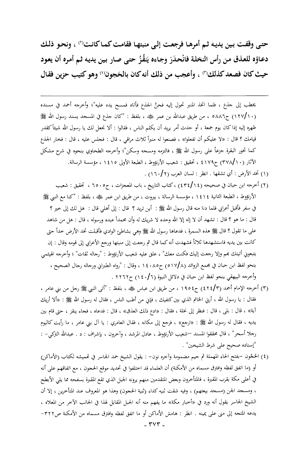 (¬1) أخرجه ابن حبان في صحيحه (14/ 434) , كتاب التاريخ , باب المعجزات , ح 6505 , تحقيق: شعيب الأرنؤوط , الطبعة الثانية 1414 , مؤسسة الرسالة , بيروت , من طريق ابن عمر - رضي الله عنه - , بلفظ: "كنا مع النبي - صلى الله عليه وسلم - في سفر فأقبل أعرابي فلما دنا منه قال رسول الله - صلى الله عليه وسلم -: أين تريد؟ قال: إلى أهلي قال: هل لك إلى خير؟ قال: ما هو؟ قال: تشهد أن لا إله إلا الله وحده لا شريك له وأن محمداً عبده ورسوله , قال: هل من شاهد على ما تقول؟ قال - صلى الله عليه وسلم - هذه السمرة , فدعاها رسول الله - صلى الله عليه وسلم - وهي بشاطئ الوادي فأقبلت تخد الأرض خداً حتى كانت بين يديه فاستشهدها ثلاثاً فشهدت أنه كما قال ثم رجعت إلى منبتها ورجع الأعرابي إلى قومه وقال: إن يتبعوني أتيتك بهم وإلا رجعت إليك فكنت معك" , علق عليه شعيب الأرنؤوط: "رجاله ثقات"؛ وأخرجه الهيثمي بنحو لفظ ابن حبان في مجمع الزوائد (8/ 517) ح 14085 , وقال: "رواه الطبراني ورجاله رجال الصحيح , وأخرجه البيهقي بنحو لفظ ابن حبان في دلائل النبوة (6/ 140) ح 2262.