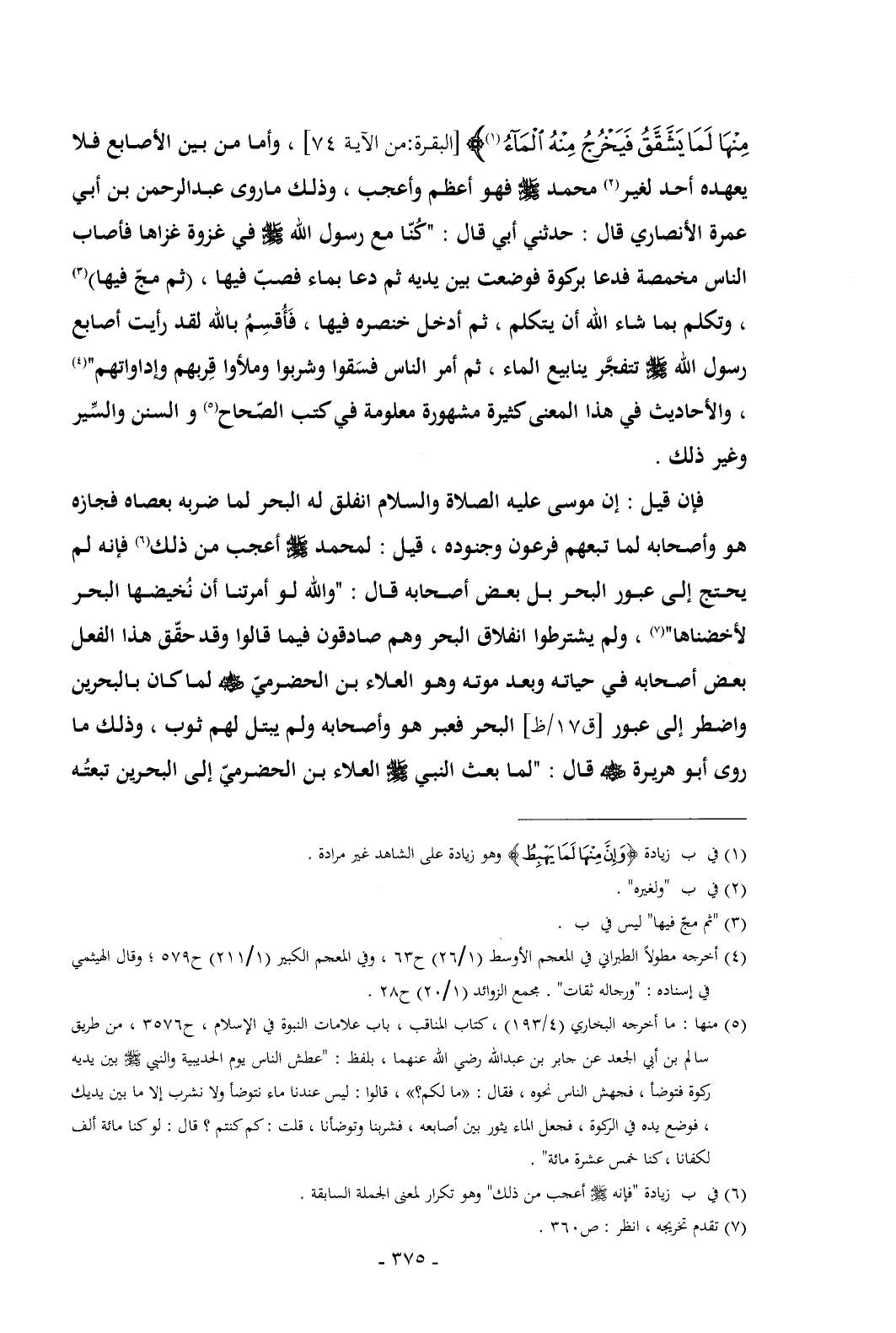مِنْهَا لَمَا يَشَّقَّقُ فَيَخْرُجُ مِنْهُ الْمَاءُ (¬1)} [البقرة: من الآية 74] , وأما من بين الأصابع فلا يعهده أحد لغير (¬2) محمد - صلى الله عليه وسلم - فهو أعظم وأعجب , وذلك ماروى عبدالرحمن بن أبي عمرة الأنصاري قال: حدثني أبي قال: "كُنّا مع رسول الله - صلى الله عليه وسلم - في غزوة غزاها فأصاب الناس مخمصة فدعا بركوة فوضعت بين يديه ثم دعا بماء فصبّ فيها , (ثم مجّ فيها) (¬3) , وتكلم بما شاء الله أن يتكلم , ثم أدخل خنصره فيها , فَأُقسِمُ بالله لقد رأيت أصابع رسول الله - صلى الله عليه وسلم - تتفجَّر ينابيع الماء , ثم أمر الناس فسَقوا وشربوا وملأوا قِربهم وإداواتهم" (¬4) , والأحاديث في هذا المعنى كثيرة مشهورة معلومة في كتب الصّحاح (¬5) والسنن والسِّير وغير ذلك.