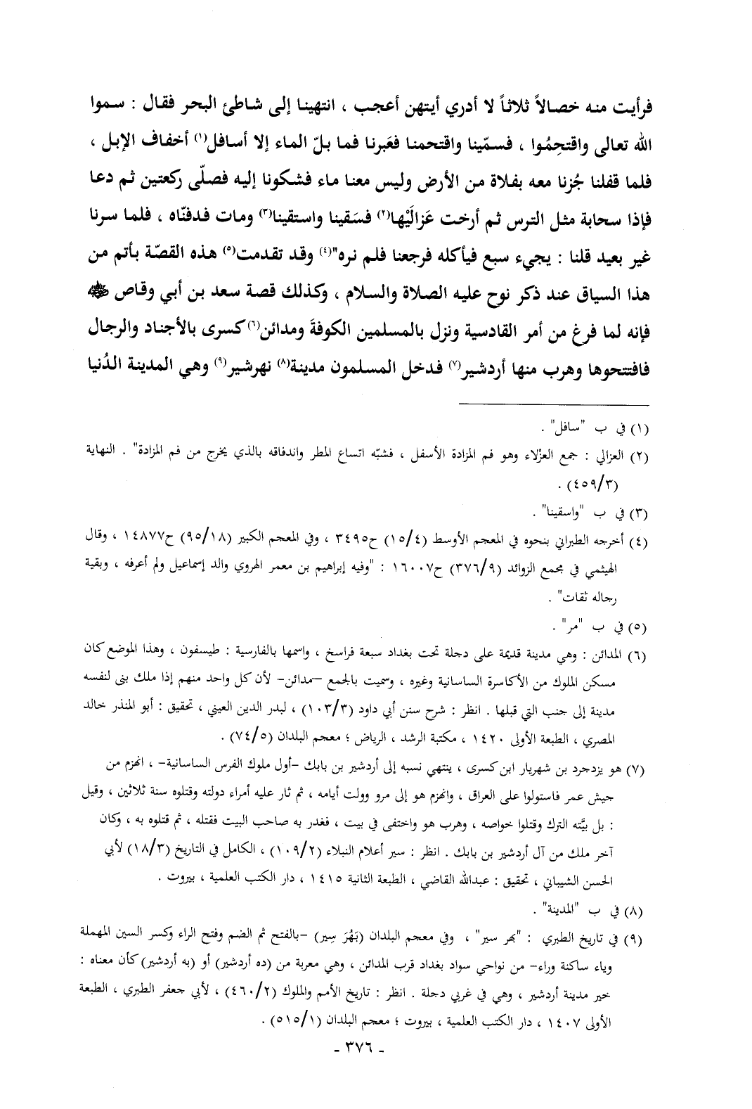 فرأيت منه خصالاً ثلاثاً لا أدري أيتهن أعجب , انتهينا إلى شاطئ البحر فقال: سموا الله تعالى واقتحِمُوا , فسمّينا واقتحمنا فعَبرنا فما بلّ الماء إلا أسافل (¬1) أخفاف الإبل , فلما قفلنا جُزنا معه بفلاة من الأرض وليس معنا ماء فشكونا إليه فصلّى ركعتين ثم دعا فإذا سحابة مثل الترس ثم أرخت عَزالَيْها (¬2) فسَقينا واستقينا (¬3) ومات فدفنّاه , فلما سرنا غير بعيد قلنا: يجيء سبع فيأكله فرجعنا فلم نره" (¬4) وقد تقدمت (¬5) هذه القصّة بأتم من هذا السياق عند ذكر نوح عليه الصلاة والسلام , وكذلك قصة سعد بن أبي وقاص - رضي الله عنه - فإنه لما فرغ من أمر القادسية ونزل بالمسلمين الكوفةَ ومدائن (¬6) كسرى بالأجناد والرجال فافتتحوها وهرب منها أردشير (¬7) فدخل المسلمون مدينة (¬8) نهرشير (¬9) وهي المدينة الدُنيا