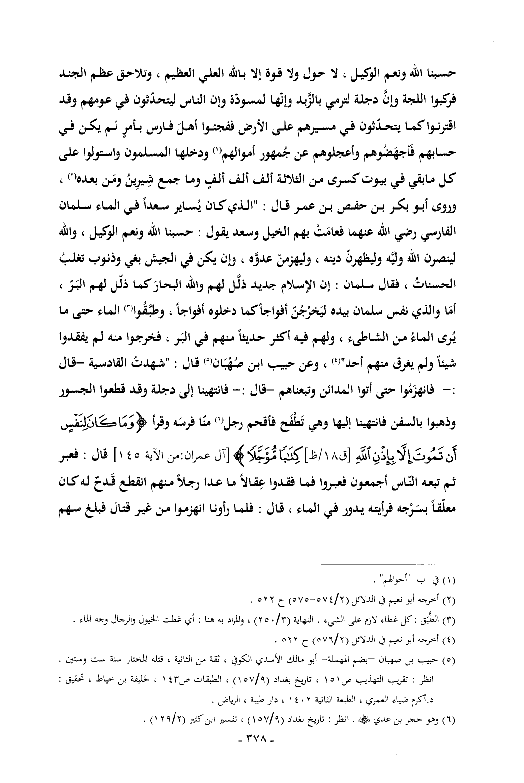 حسبنا الله ونعم الوكيل , لا حول ولا قوة إلا بالله العلي العظيم , وتلاحق عظم الجند فركبوا اللجة وإنَّ دجلة لترمي بالزَّبد وإنّها لمسودّة وإن الناس ليتحدّثون في عومهم وقد اقترنوا كما يتحدّثون في مسيرهم على الأرض ففجئوا أهلَ فارس بأمرٍ لم يكن في حسابهم فَأجهَضُوهم وأعجلوهم عن جُمهور أموالهم (¬1) ودخلها المسلمون واستولوا على كل مابقي في بيوت كسرى من الثلاثة ألف ألف ألفٍ وما جمع شِيرِينُ ومَن بعده (¬2) , وروى أبو بكر بن حفص بن عمر قال: "الذي كان يُساير سعداً في الماء سلمان الفارسي رضي الله عنهما فعامَتْ بهم الخيل وسعد يقول: حسبنا الله ونعم الوكيل , والله لينصرن الله وليَّه وليظهرنّ دينه , وليهزمنّ عدوَّه , وإن يكن في الجيش بغي وذنوب تغلبُ الحسناتُ , فقال سلمان: إن الإسلام جديد ذلَّل لهم والله البحارَ كما ذلّل لهم البَرّ , أمَا والذي نفس سلمان بيده ليَخرُجُنّ أفواجاً كما دخلوه أفواجاً , وطبَّقُوا (¬3) الماء حتى ما يُرى الماءُ من الشاطئ , ولهم فيه أكثر حديثاً منهم في البَر , فخرجوا منه لم يفقدوا شيئاً ولم يغرق منهم أحد" (¬4) , وعن حبيب ابن صُهْبَان (¬5) قال: "شهدتُ القادسية -قال: - فانهزَمُوا حتى أتوا المدائن وتبعناهم -قال: - فانتهينا إلى دجلة وقد قطعوا الجسور وذهبوا بالسفن فانتهينا إليها وهي تَطْفَح فأقحم رجل (¬6) منّا فرسَه وقرأ {وَمَا كَانَ لِنَفْسٍ أَنْ تَمُوتَ إِلَّا بِإِذْنِ اللَّهِ [ق 18/ظ] كِتَابًا مُؤَجَّلًا} [آل عمران: من الآية 145] قال: فعبر ثم تبعه النّاس أجمعون فعبروا فما