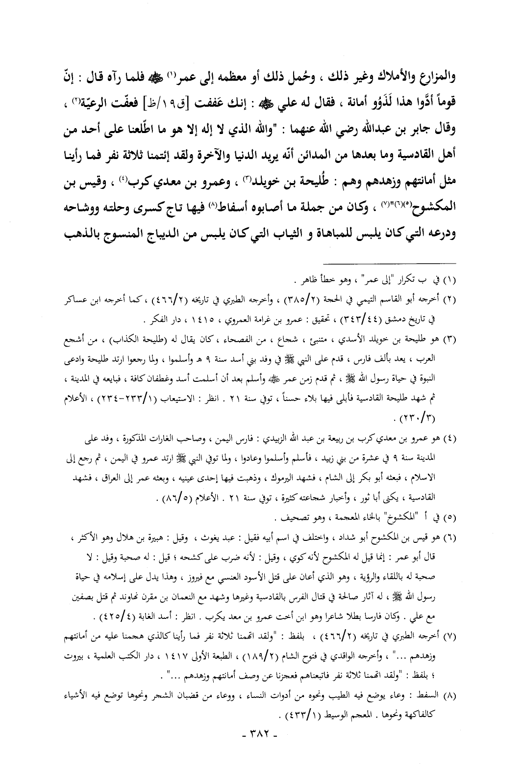 والمزارع والأملاك وغير ذلك , وحُمل ذلك أو معظمه إلى عمر (¬1) - رضي الله عنه - فلما رآه قال: إنّ قوماً أدَّوا هذا لَذَوُو أمانة , فقال له علي - رضي الله عنه -: إنك عَففت [ق 19/ظ] فعفّت الرعيّة (¬2) , وقال جابر بن عبدالله رضي الله عنهما: "والله الذي لا إله إلا هو ما اطّلعنا على أحد من أهل القادسية وما بعدها من المدائن أنّه يريد الدنيا والآخرة ولقد إئتمنا ثلاثة نفر فما رأينا مثل أمانتهم وزهدهم وهم: طُليحة بن خويلد (¬3) , وعمرو بن معدي كرب (¬4) , وقيس بن المكشوح (¬5) (¬6) " (¬7) , وكان من جملة ما أصابوه أسفاط (¬8) فيها تاج كسرى وحلته ووشاحه