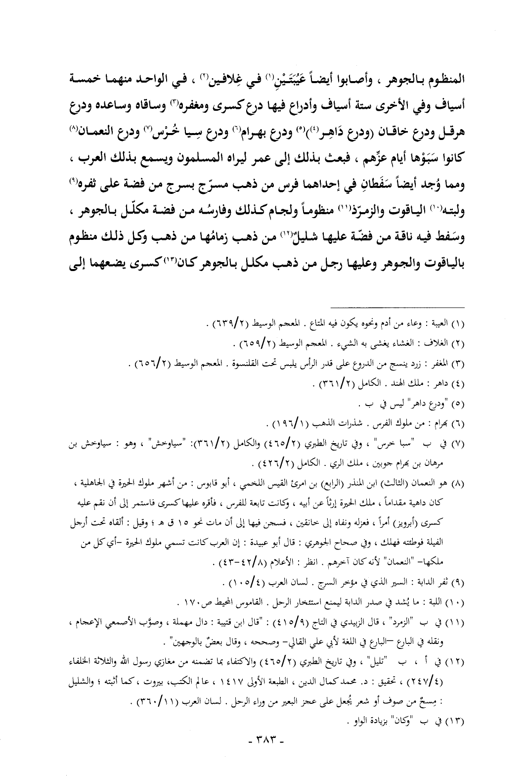المنظوم بالجوهر , وأصابوا أيضاً عَيُبَتَيْنِ (¬1) في غِلافين (¬2) , في الواحد منهما خمسة أسياف وفي الأخرى ستة أسياف وأدراع فيها درع كسرى ومغفره (¬3) وساقاه وساعده ودرع هرقل ودرع خاقان (ودرع دَاهِر (¬4)) (¬5) ودرع بهرام (¬6) ودرع سِيا خُرْس (¬7) ودرع النعمان (¬8) كانوا سَبَوْها أيام عزِّهم , فبعث بذلك إلى عمر ليراه المسلمون ويسمع بذلك العرب , ومما وُجد أيضاً سَفَطانِ في إحداهما فرس من ذهب مسرّج بسرج من فضة على ثفره (¬9) ولبته (¬10) الياقوت والزمرّذ (¬11) منظوماً ولجام كذلك وفارسُه من فضة مكلّل بالجوهر , وسَفط فيه ناقة من فضّة عليها شليلٌ (¬12) من ذهب زمامُها من ذهب وكل ذلك منظوم بالياقوت والجوهر وعليها رجل من ذهب مكلل