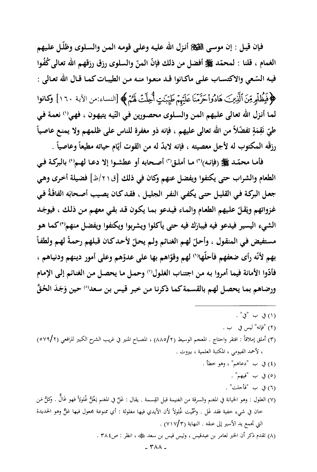فأما محمّد - صلى الله عليه وسلم - (فإنه) (¬2) ما أملق (¬3) أصحابه أو عطشوا إلا دعا لهم (¬4) بالبركة في الطعام والشراب حتى يكتفوا ويفضل عنهم وكان في ذلك [ق 21/ظ] فضيلة أخرى وهي جعل البركة في القليل حتى يكفي النفر الجليل , فقد كان يصيب أصحابَه الفاقَةُ في غزواتهم ويَقلّ عليهم الطعام والماء فيدعو بما يكون قد بقي معهم من ذلك , فيوجَد الشيء اليسير فيدعو فيه فيبارَك فيه حتى يأكلوا ويشربوا ويكتفوا ويفضل منهم (¬5) كما هو مستفيض في المنقول , وأحلّ لهم الغنائم ولم يحلّ لأحد كان قبلهم رحمةً لهم ولطفاً بهم لأنّه رأى ضعفهم فأحلّها (¬6) لهم وقوّاهم بها على عدوّهم وعلى أمور دينهم ودنياهم , فأدّوا الأمانة فيما أمروا به من اجتناب الغلول (¬7) وحمل ما يحصل من الغنائم إلى الإمام