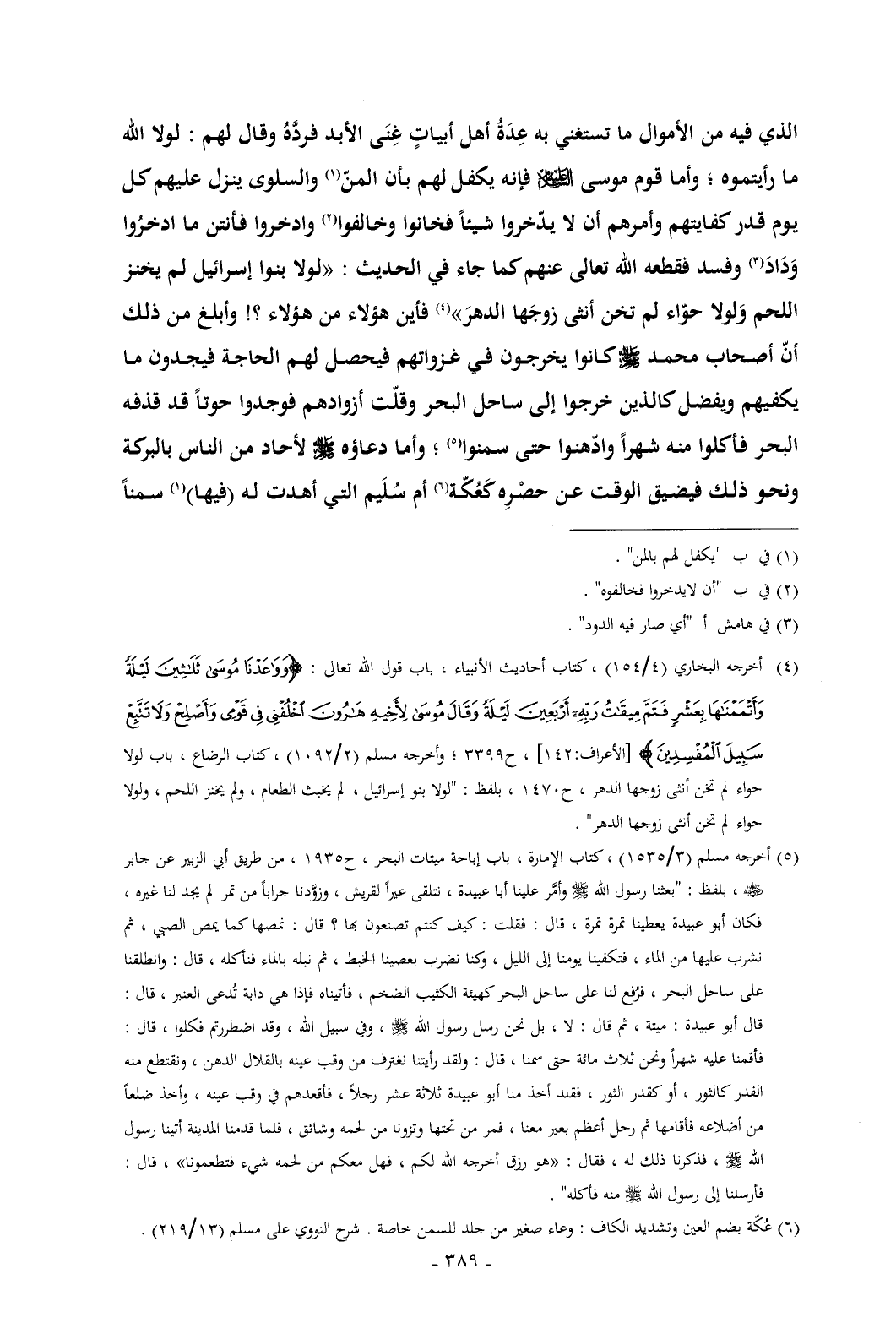 الذي فيه من الأموال ما تستغني به عِدَةُ أهل أبياتٍ غِنَى الأبد فردَّهُ وقال لهم: لولا الله ما رأيتموه؛ وأما قوم موسى - عليه السلام - فإنه يكفل لهم بأن المنّ (¬1) والسلوى ينزل عليهم كل يوم قدر كفايتهم وأمرهم أن لا يدّخروا شيئاً فخانوا وخالفوا (¬2) وادخروا فأنتن ما ادخرُوا وَدَادَ (¬3) وفسد فقطعه الله تعالى عنهم كما جاء في الحديث: «لولا بنوا إسرائيل لم يخنز اللحم وَلولا حوّاء لم تخن أنثى زوجَها الدهرَ» (¬4) فأين هؤلاء من هؤلاء؟ ! وأبلغ من ذلك أنّ أصحاب محمد - صلى الله عليه وسلم - كانوا يخرجون في غزواتهم فيحصل لهم الحاجة فيجدون ما يكفيهم ويفضل كالذين خرجوا إلى ساحل البحر وقلّت أزوادهم فوجدوا حوتاً قد قذفه البحر فأكلوا منه شهراً وادّهنوا حتى سمنوا (¬5)؛ وأما دعاؤه - صلى الله عليه وسلم - لأحاد من الناس بالبركة